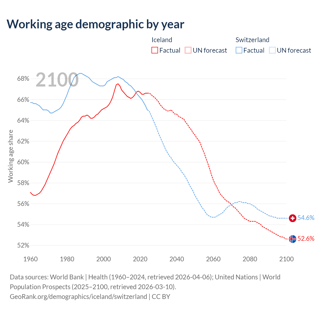 - Iceland has 264K working age adults (aged 15-64) vs 5.92M in Switzerland.