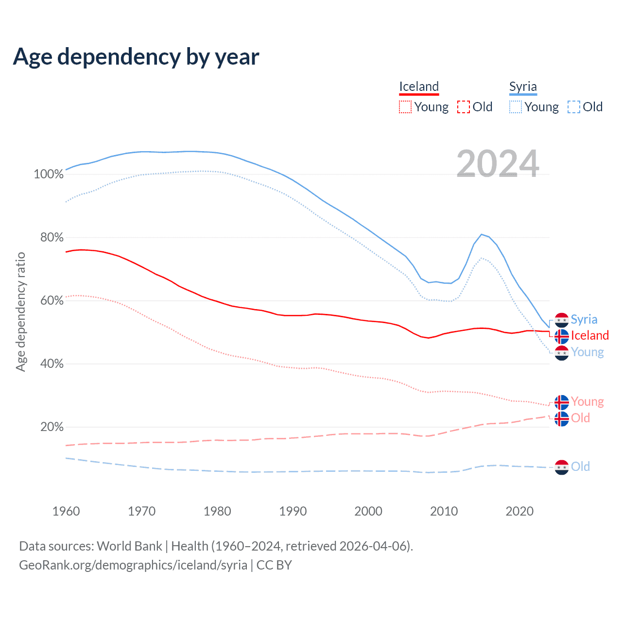 - The share of old-age demographic (65+) in Iceland is 15.6% vs 4.74% in Syria.