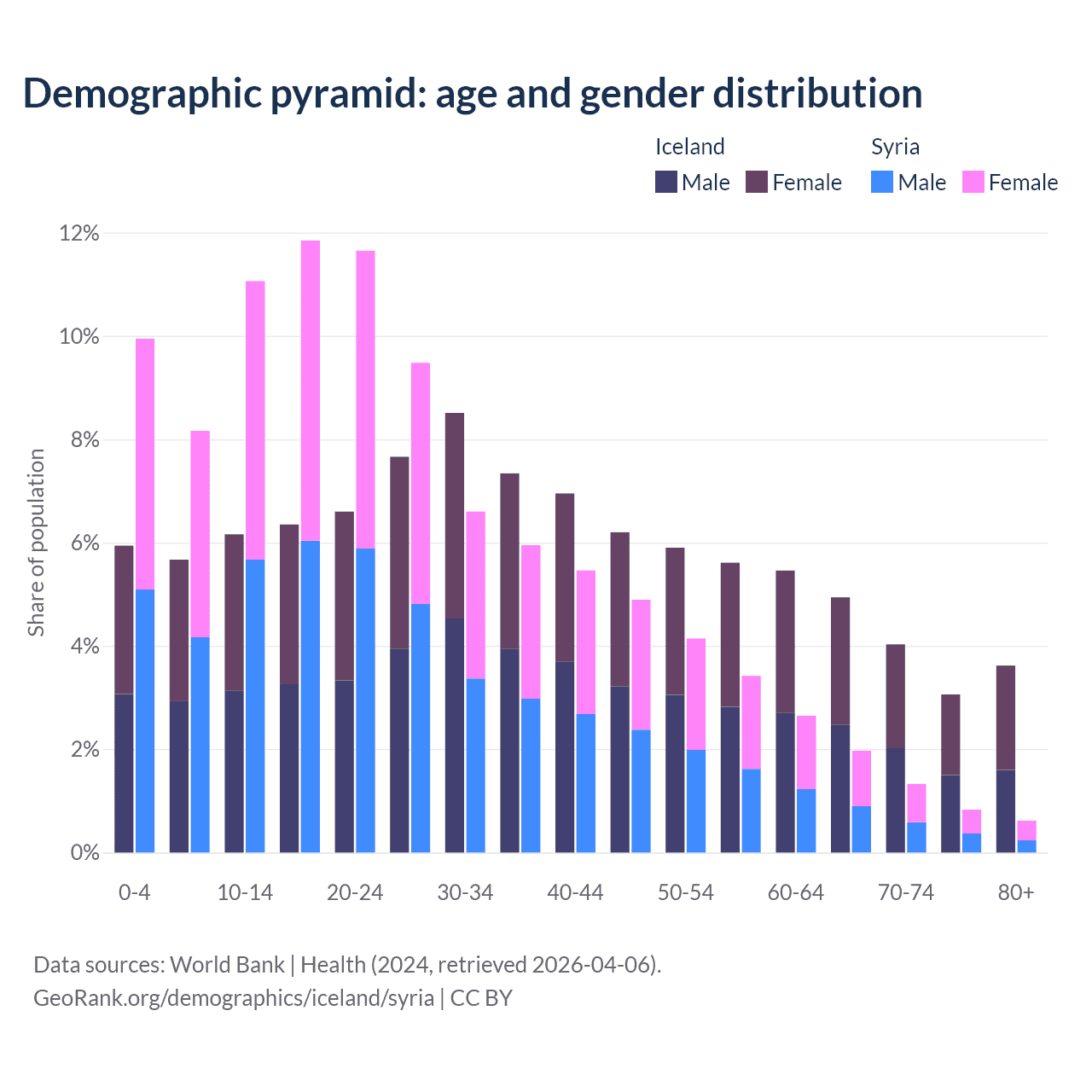 - As of 2026, the population of Iceland is 397K vs 26.8M in Syria - 67.6 times difference.