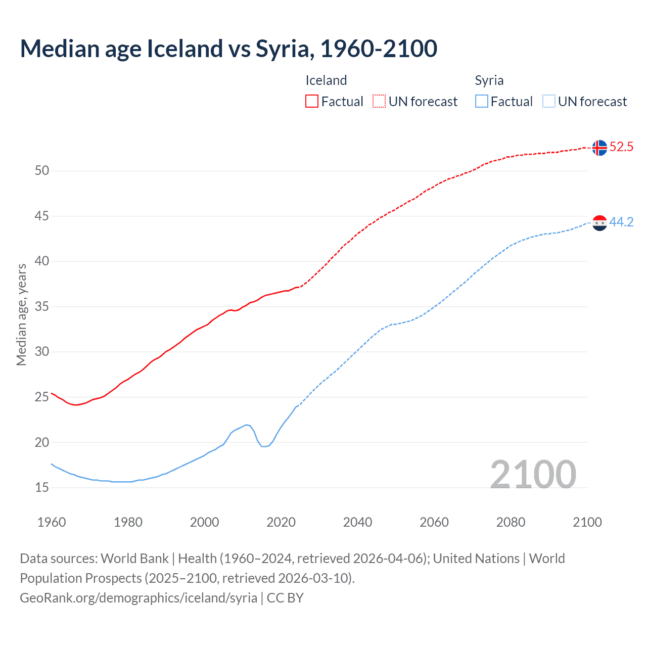 - Iceland is ranked 65/196 by median age (oldest to youngest) vs 138/196 for Syria.