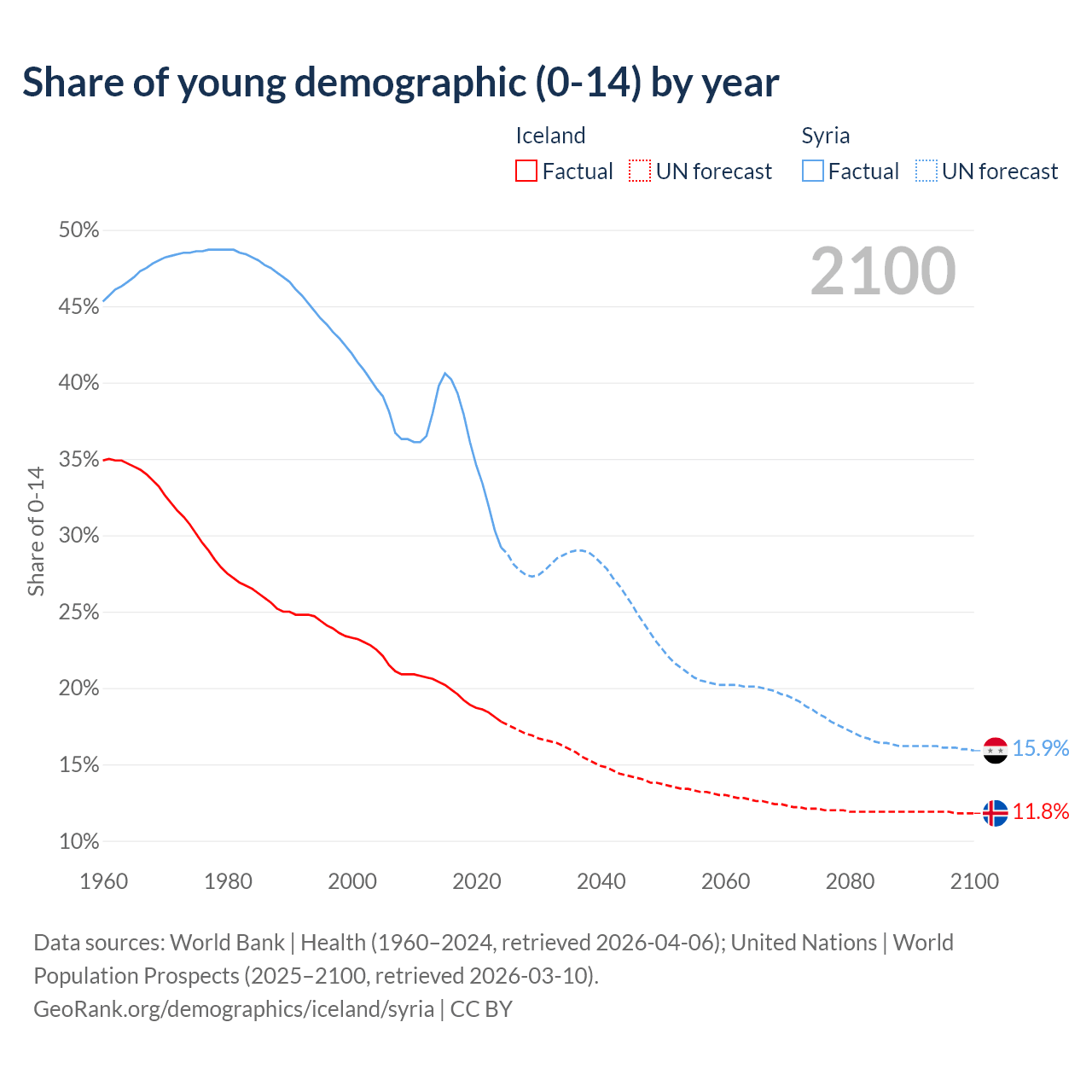 - The share of young demographic (0-15 years old) in Iceland is 17.8% vs 29.2% in Syria.
