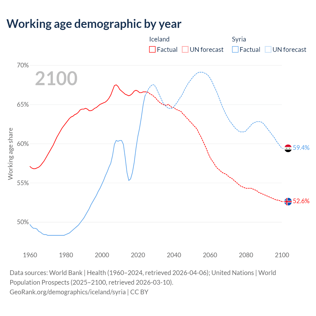 - Iceland has 264K working age adults (aged 15-64) vs 17.7M in Syria.