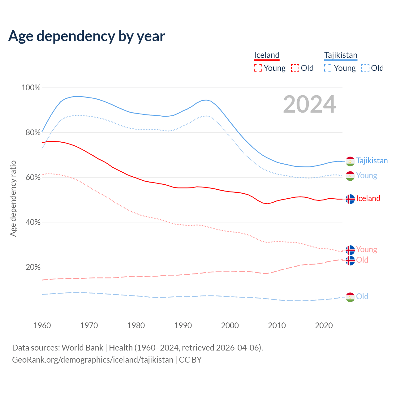 - The share of old-age demographic (65+) in Iceland is 15.6% vs 3.85% in Tajikistan.