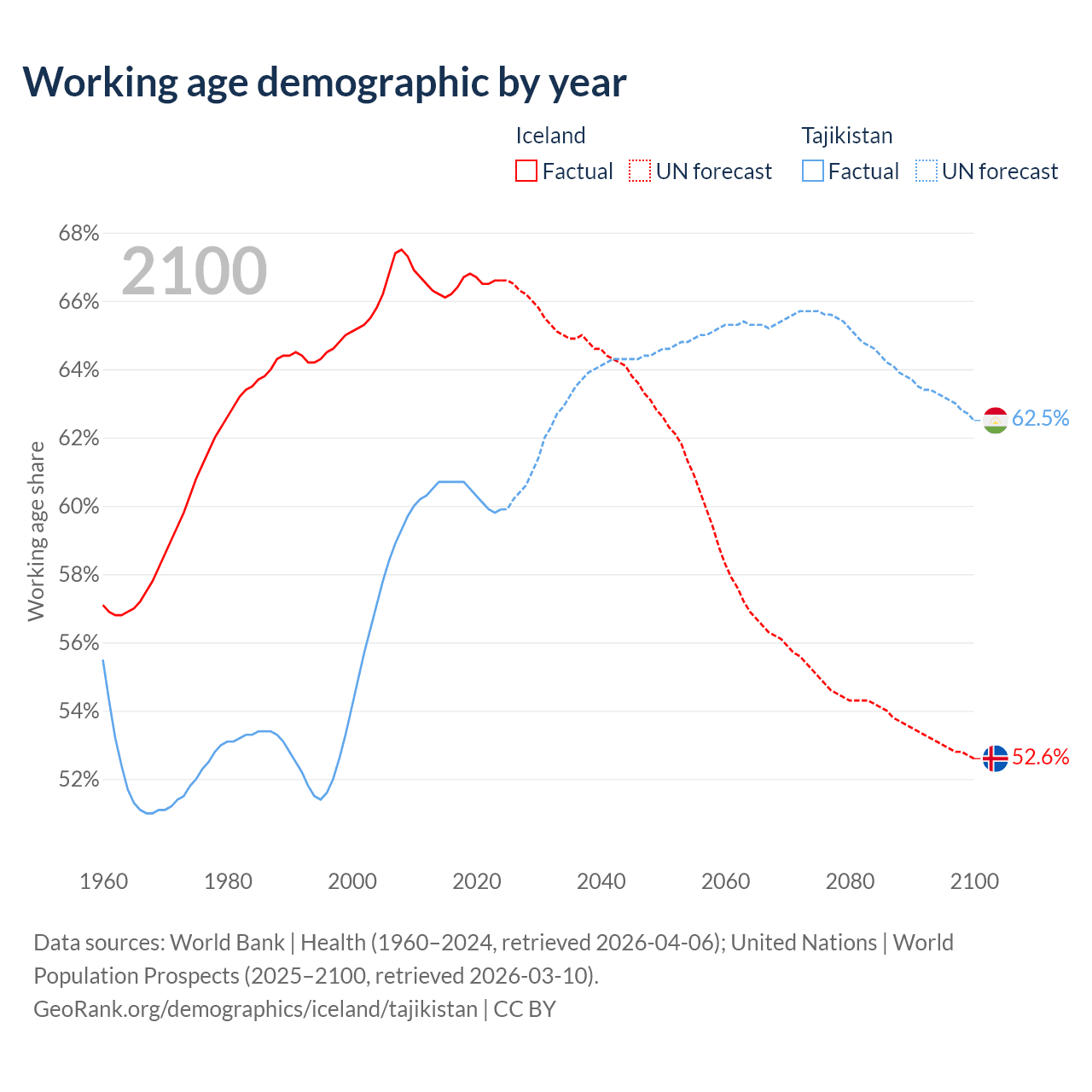 Median age Iceland vs Tajikistan, 1960-2100