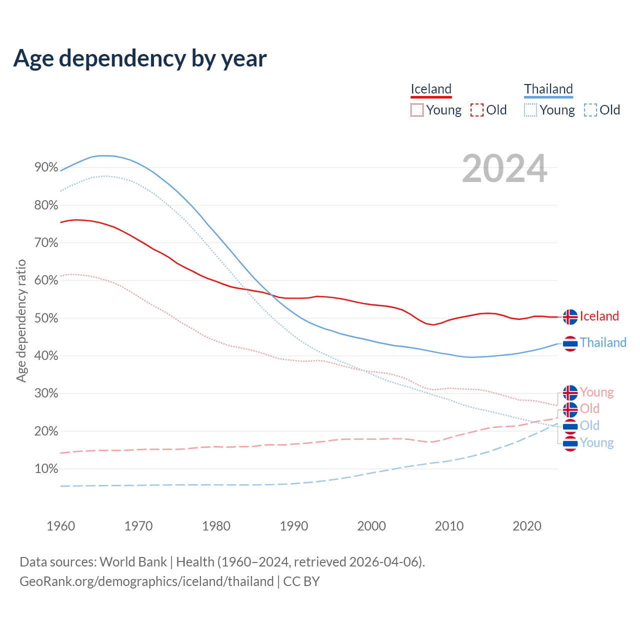 - Iceland is ranked 65/196 by median age (oldest to youngest) vs 40/196 for Thailand.