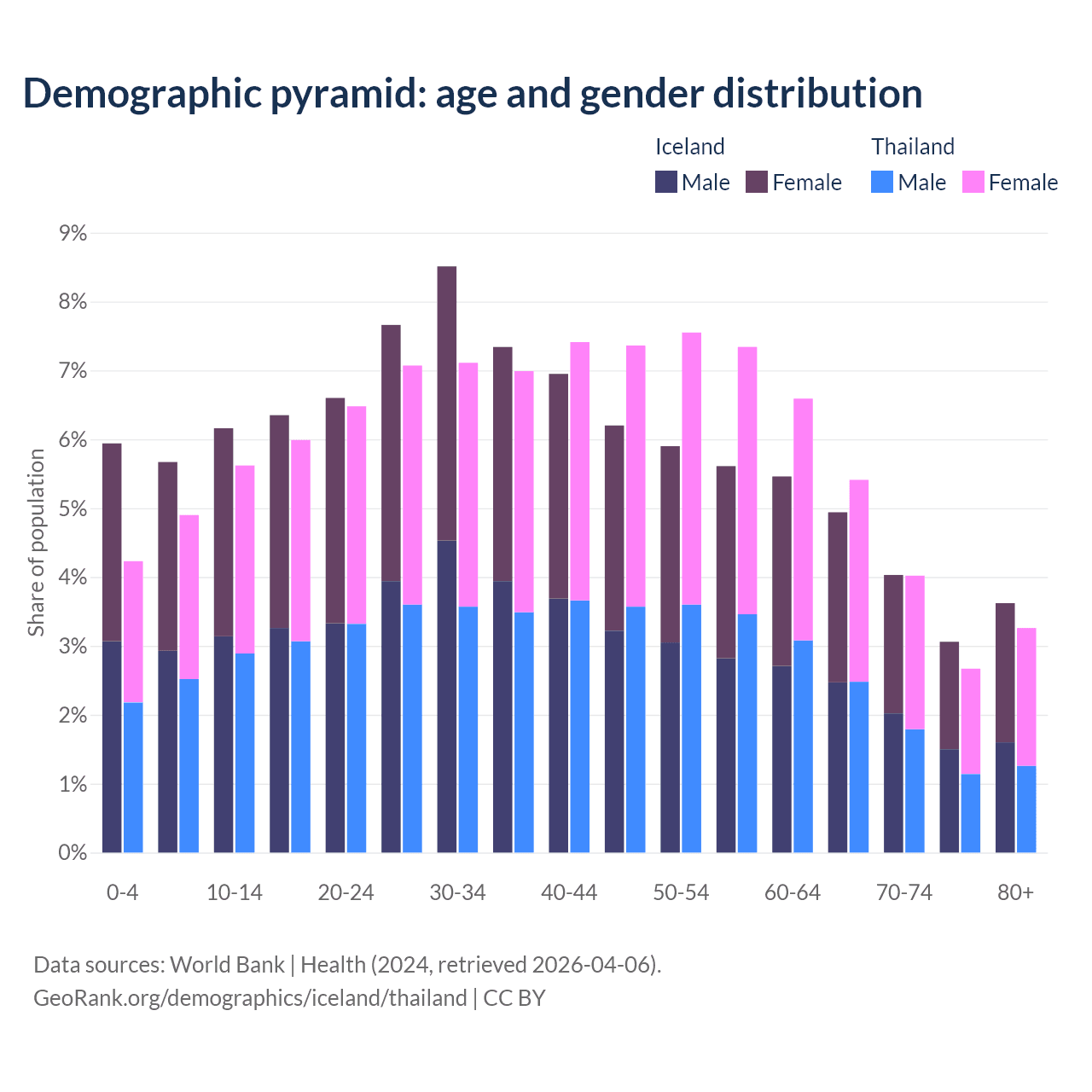 - As of 2026, the population of Iceland is 397K vs 71.6M in Thailand - 180.2 times difference.