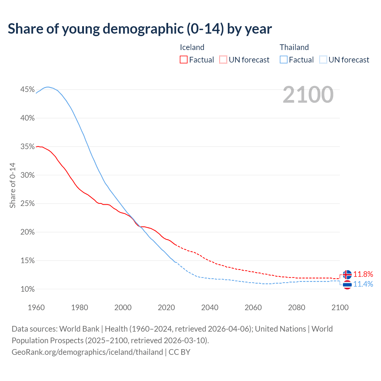 - The share of young demographic (0-15 years old) in Iceland is 17.8% vs 14.7% in Thailand.