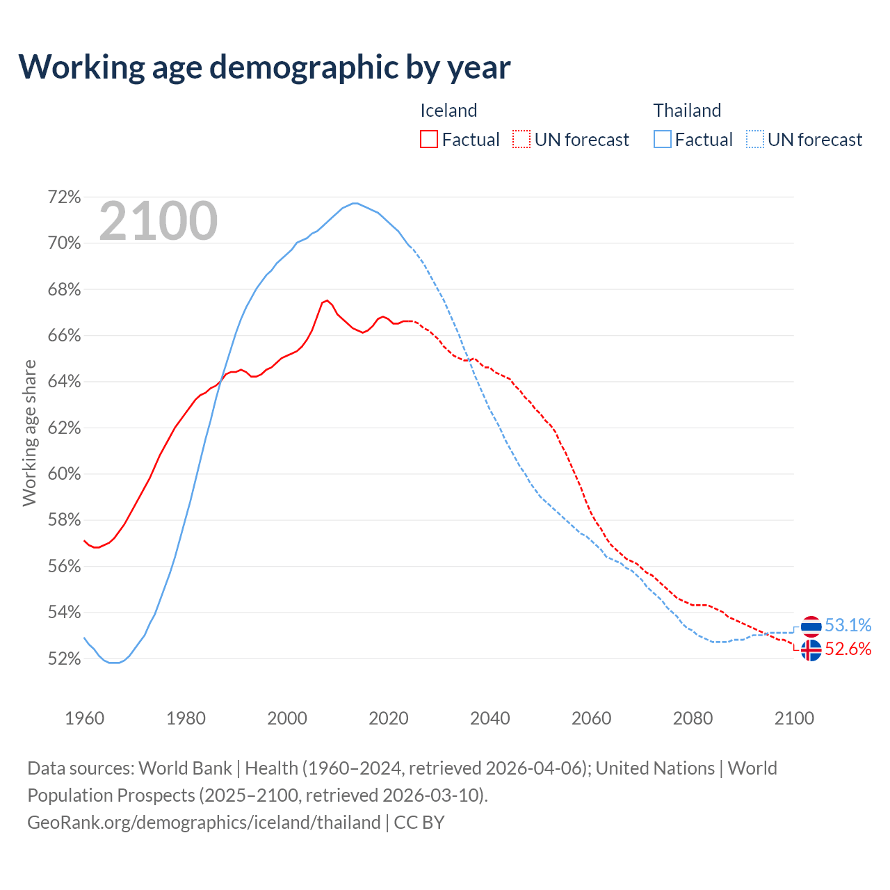 - Iceland has 264K working age adults (aged 15-64) vs 50M in Thailand.