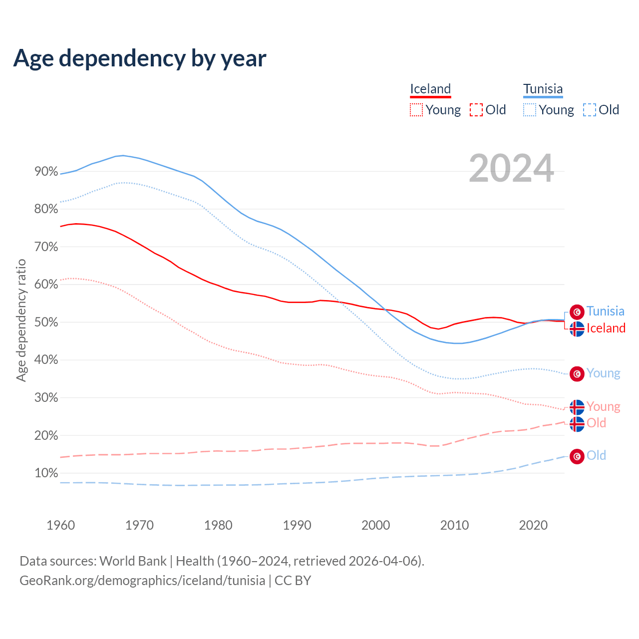 - The share of old-age demographic (65+) in Iceland is 15.6% vs 9.53% in Tunisia.