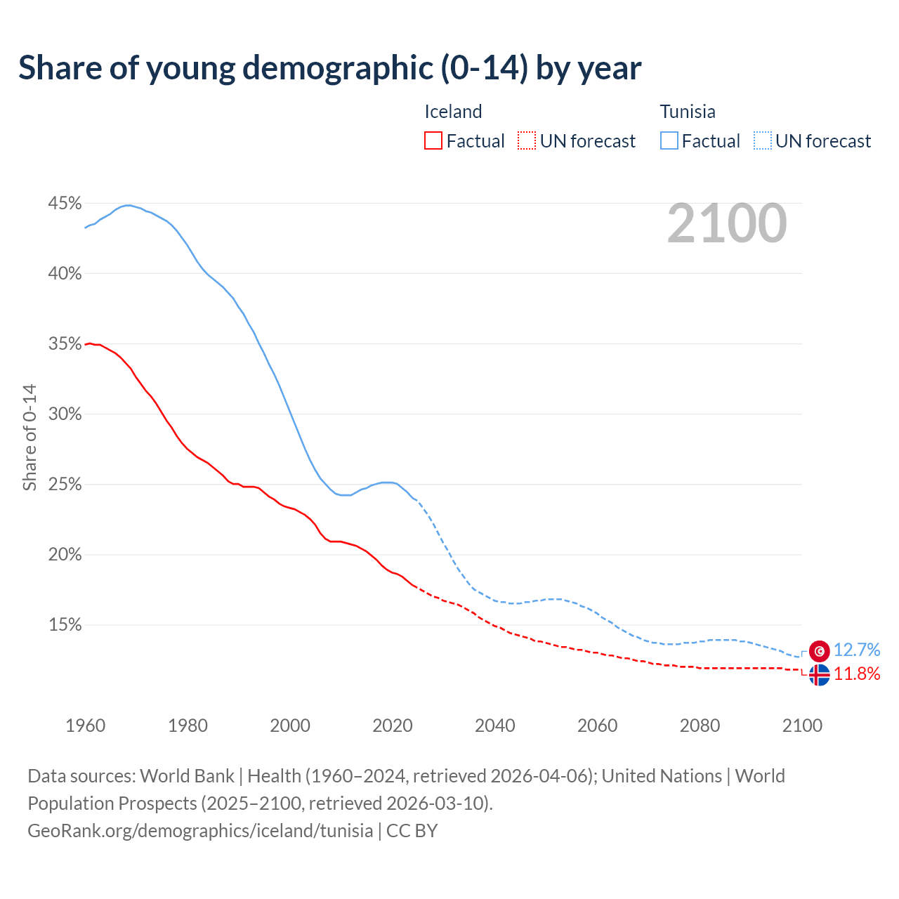 - The share of young demographic (0-15 years old) in Iceland is 17.8% vs 24% in Tunisia.