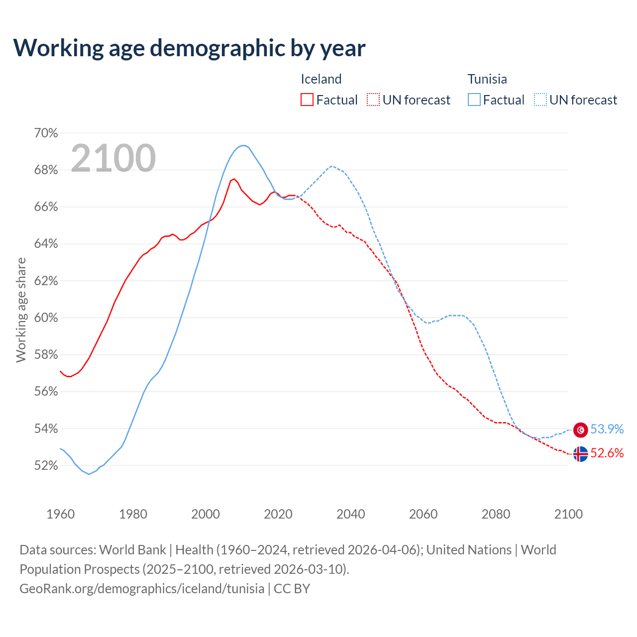 - Iceland has 264K working age adults (aged 15-64) vs 8.26M in Tunisia.