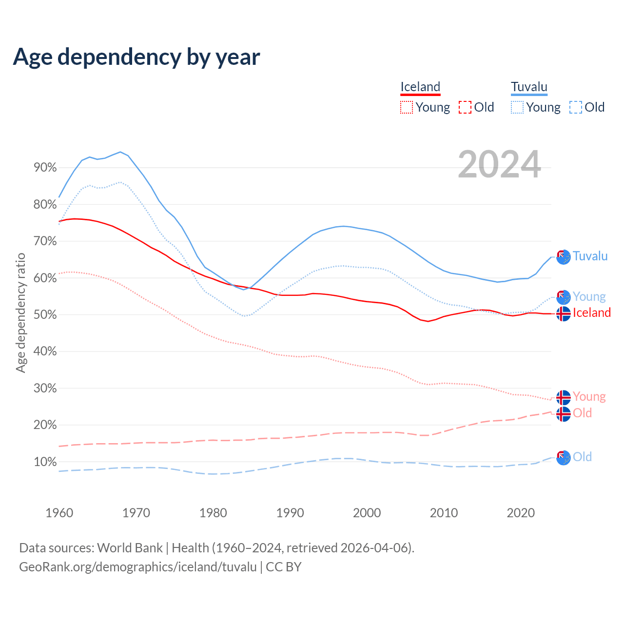 The share of older people aged 65 and over is 15.6% in Iceland and 6.67% in Tuvalu. Life expectancy in Iceland compared to Tuvalu .