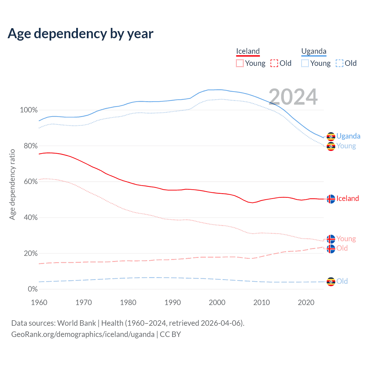 - The share of old-age demographic (65+) in Iceland is 15.6% vs 2.19% in Uganda.