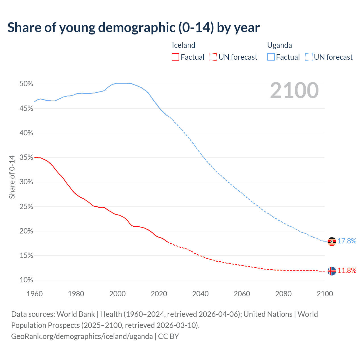 - The share of young demographic (0-15 years old) in Iceland is 17.8% vs 43.5% in Uganda.