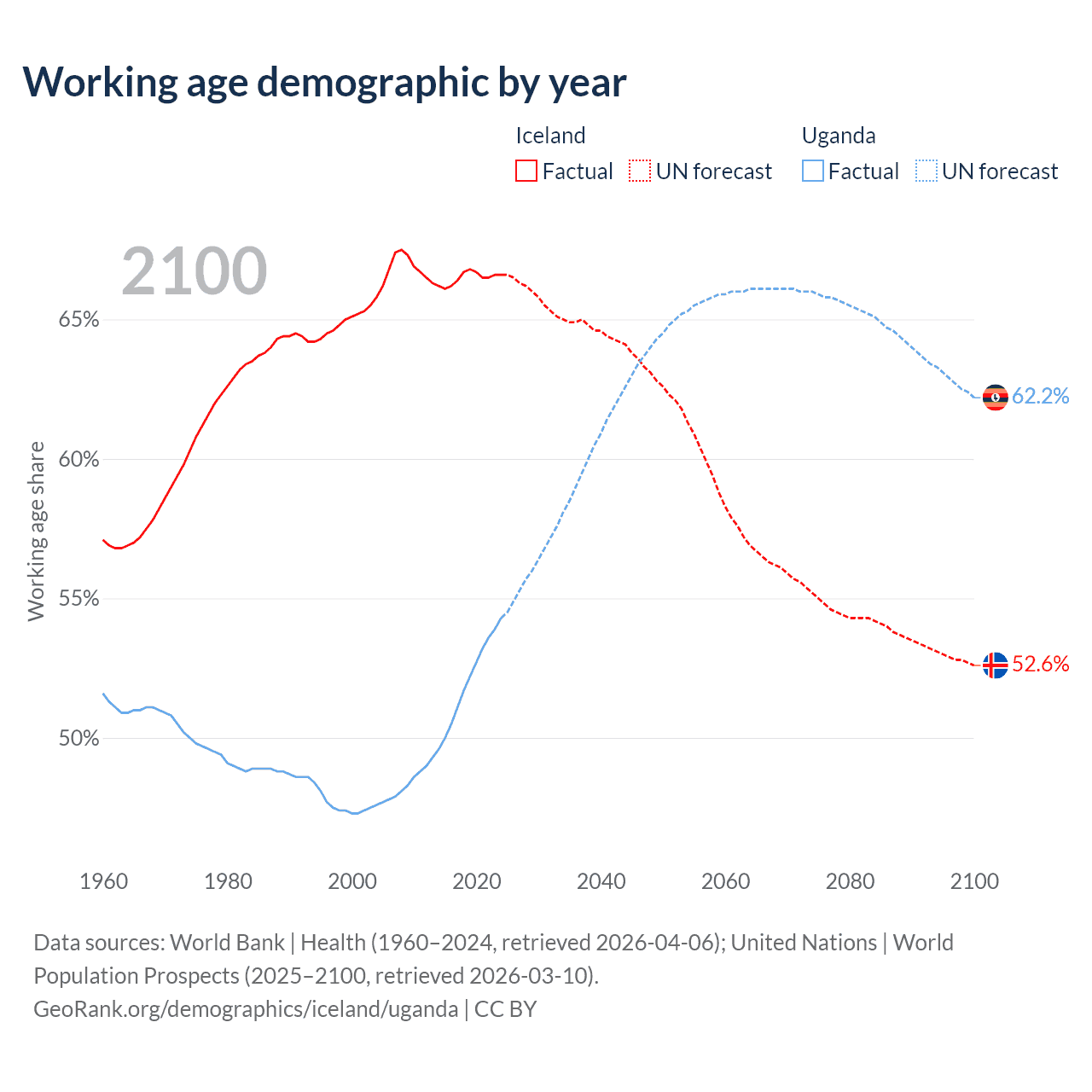 Median age Iceland vs Uganda, 1960-2100