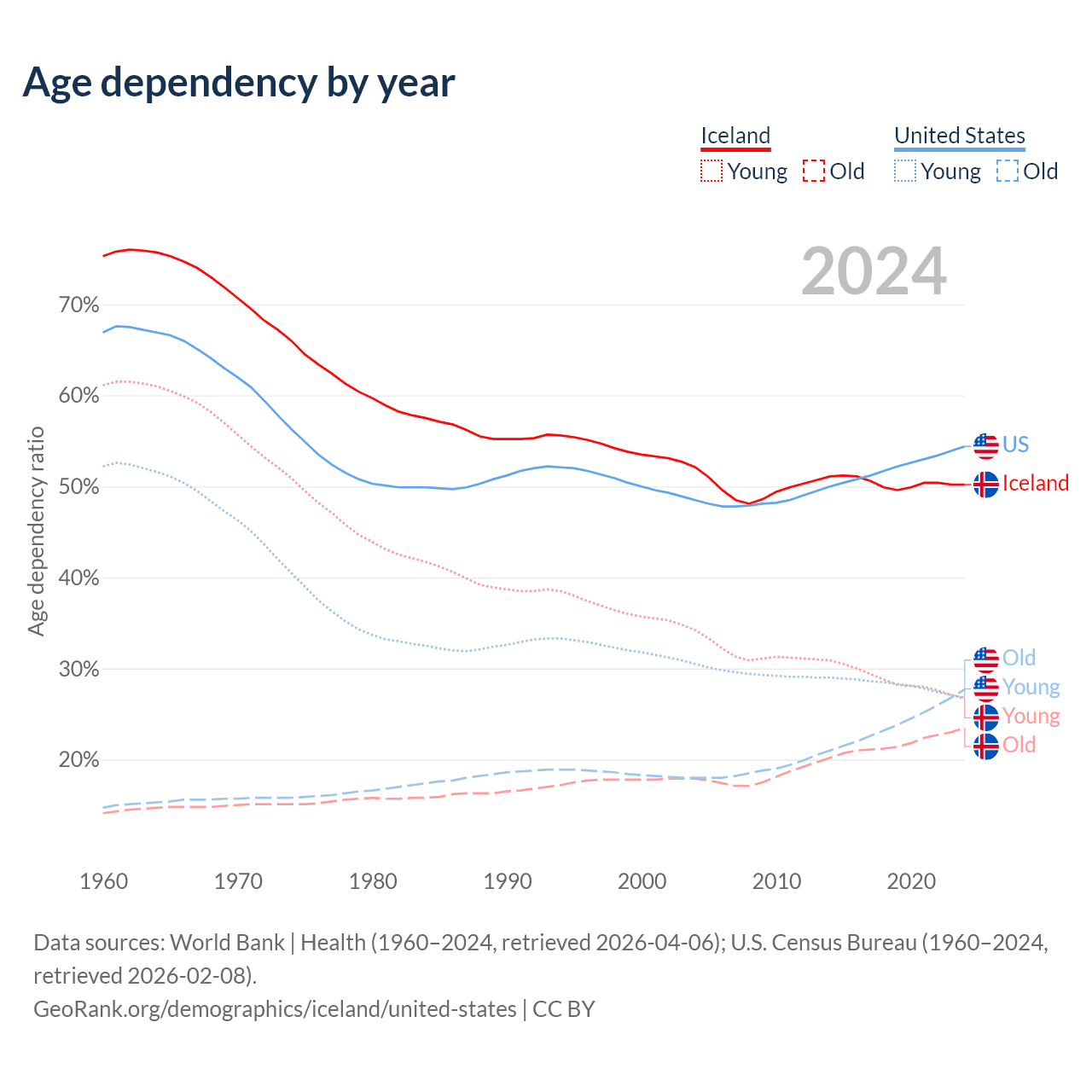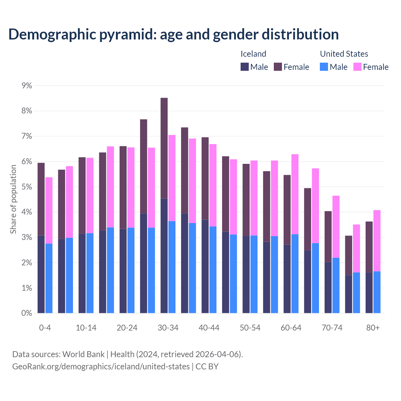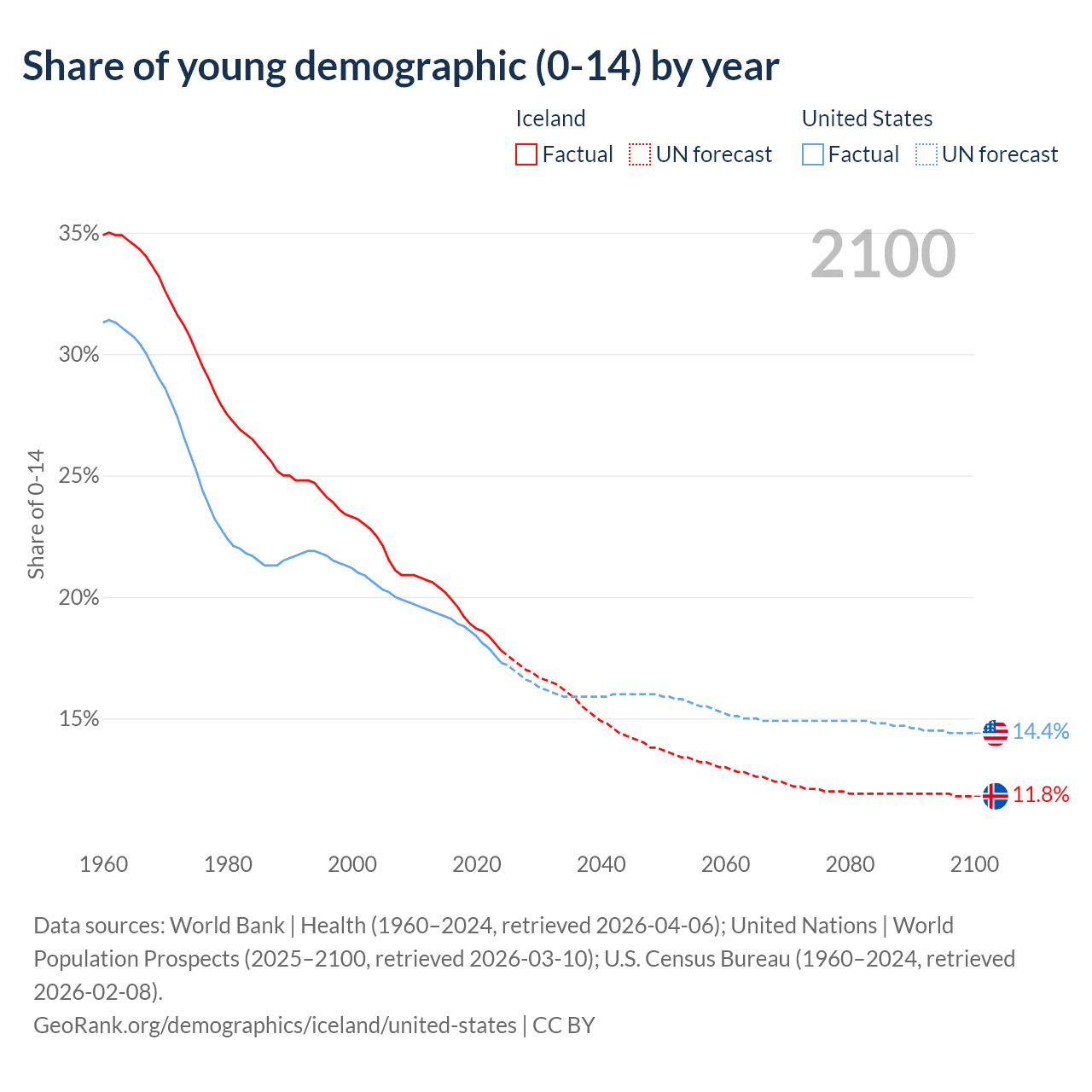- The share of young demographic (0-15 years old) in Iceland is 17.8% vs 17.3% in the United States.