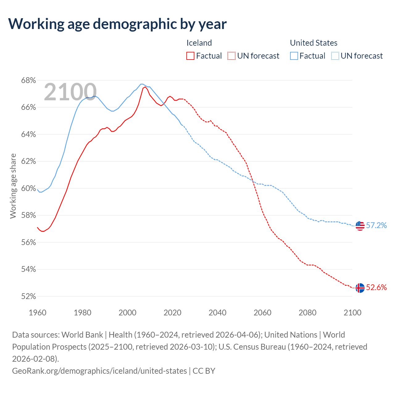 - Iceland has 264K working age adults (aged 15-64) vs 223M in the United States.