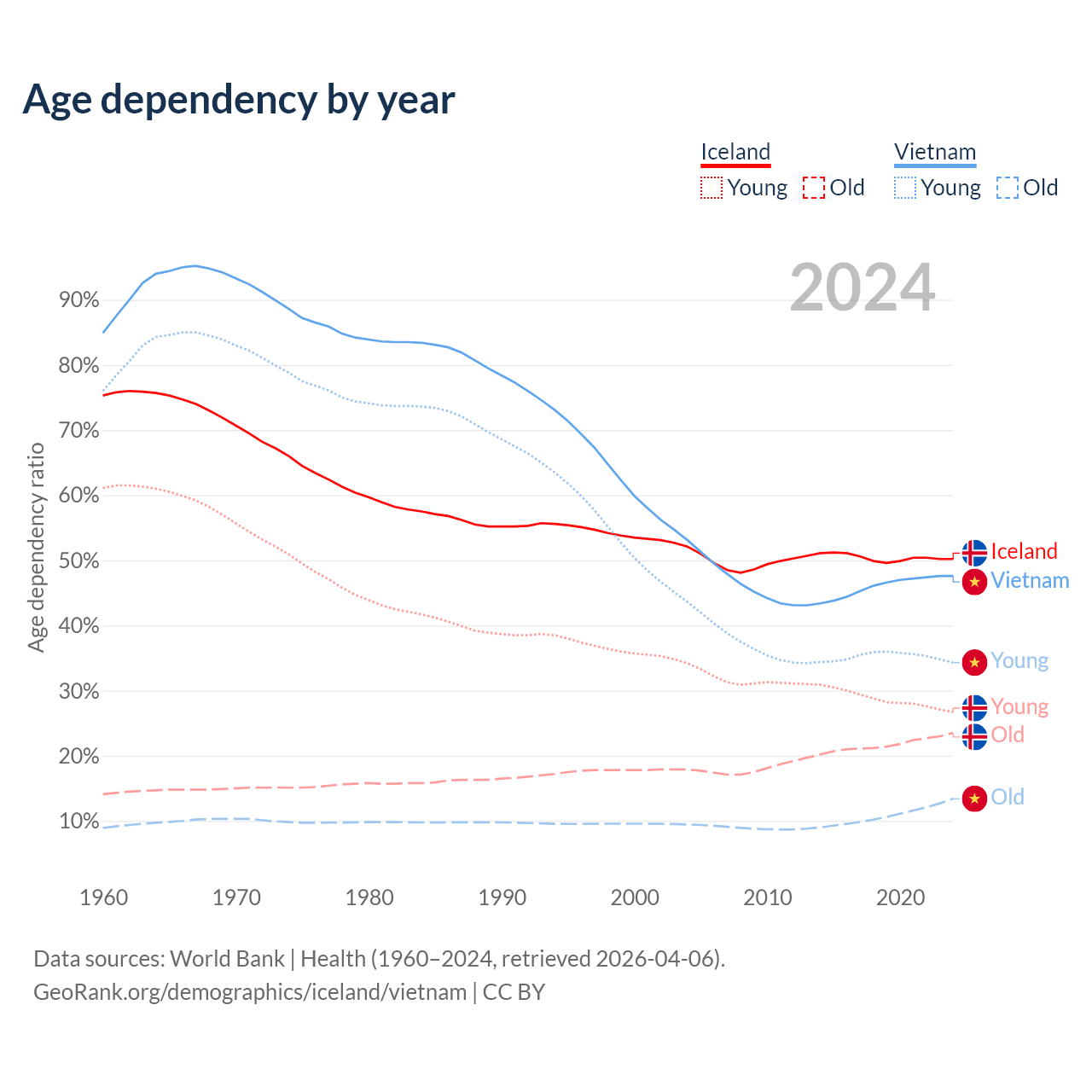 - The share of old-age demographic (65+) in Iceland is 15.6% vs 9.05% in Vietnam.