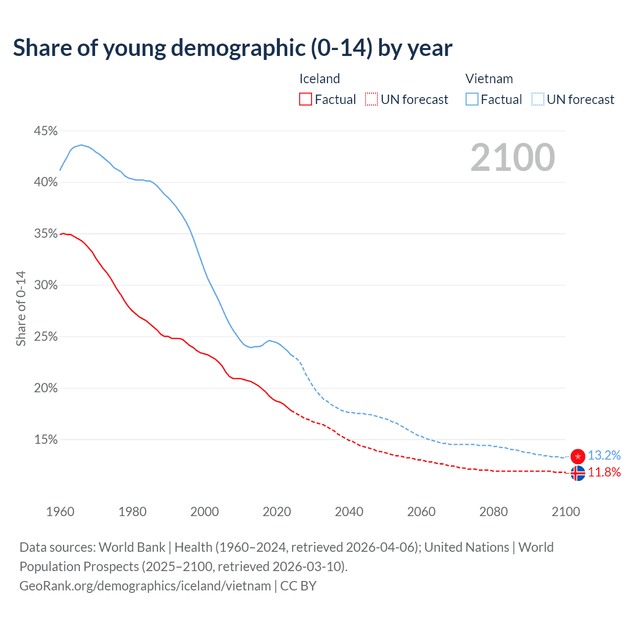 - The share of young demographic (0-15 years old) in Iceland is 17.8% vs 23.2% in Vietnam.