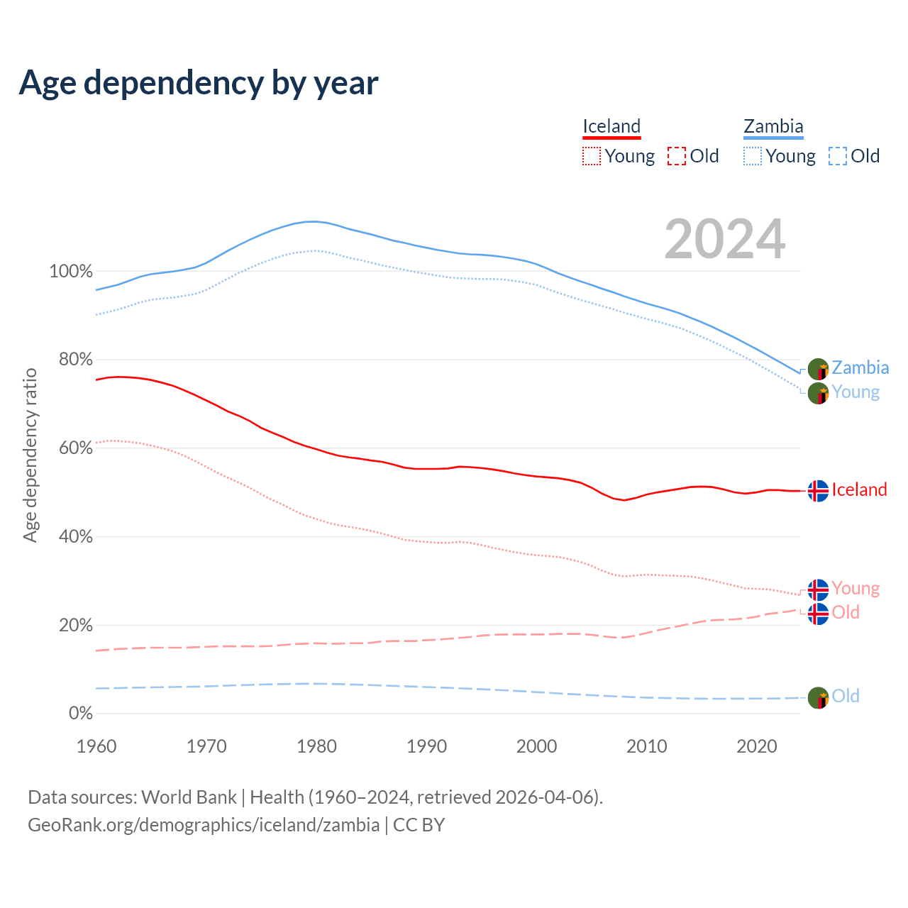 - Iceland is ranked 65/196 by median age (oldest to youngest) vs 182/196 for Zambia.