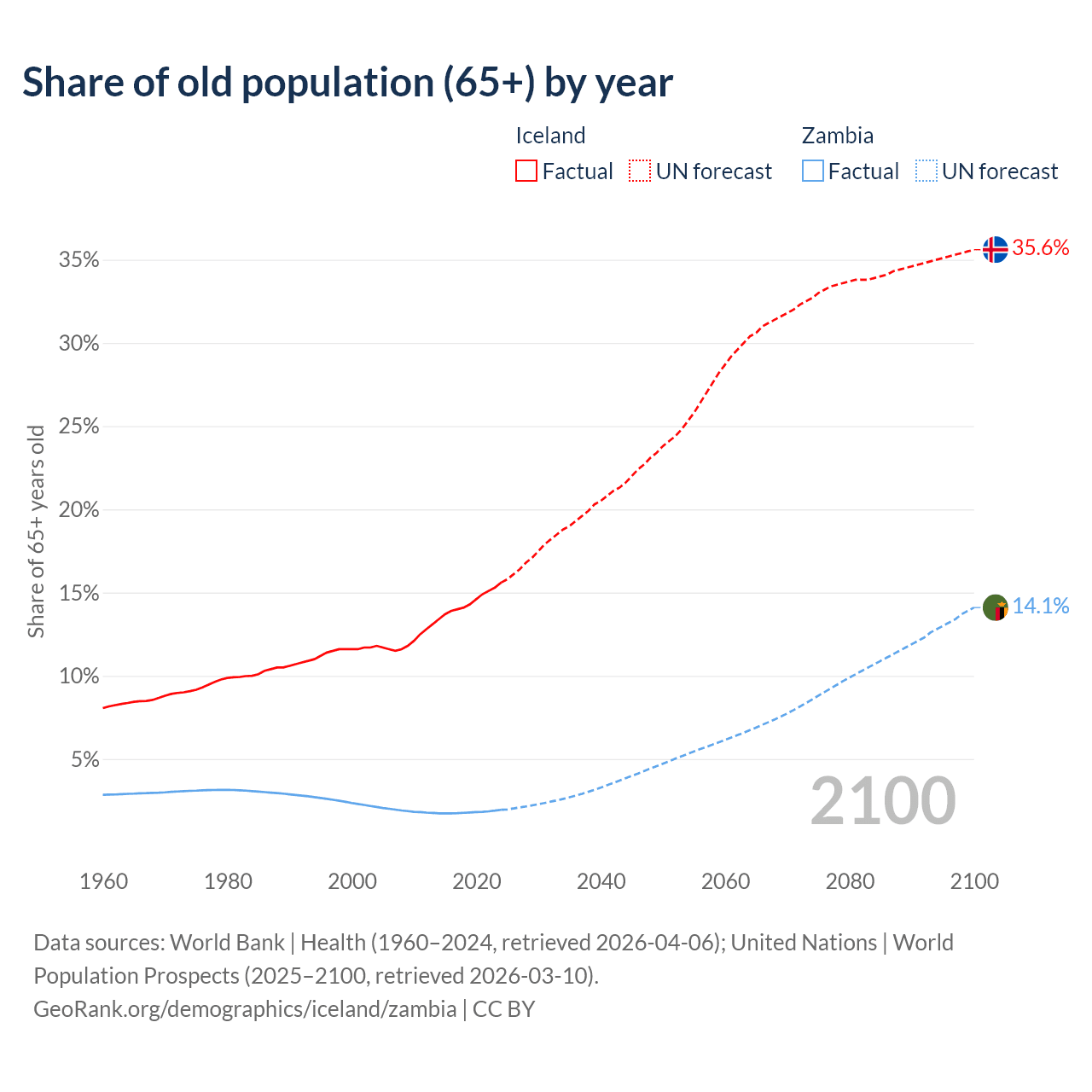 The share of older people aged 65 and over is 15.6% in Iceland and 1.95% in Zambia. Life expectancy in Iceland compared to Zambia .