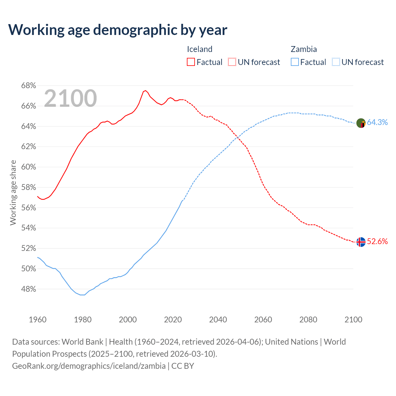 - Iceland has 264K working age adults (aged 15-64) vs 12.8M in Zambia.