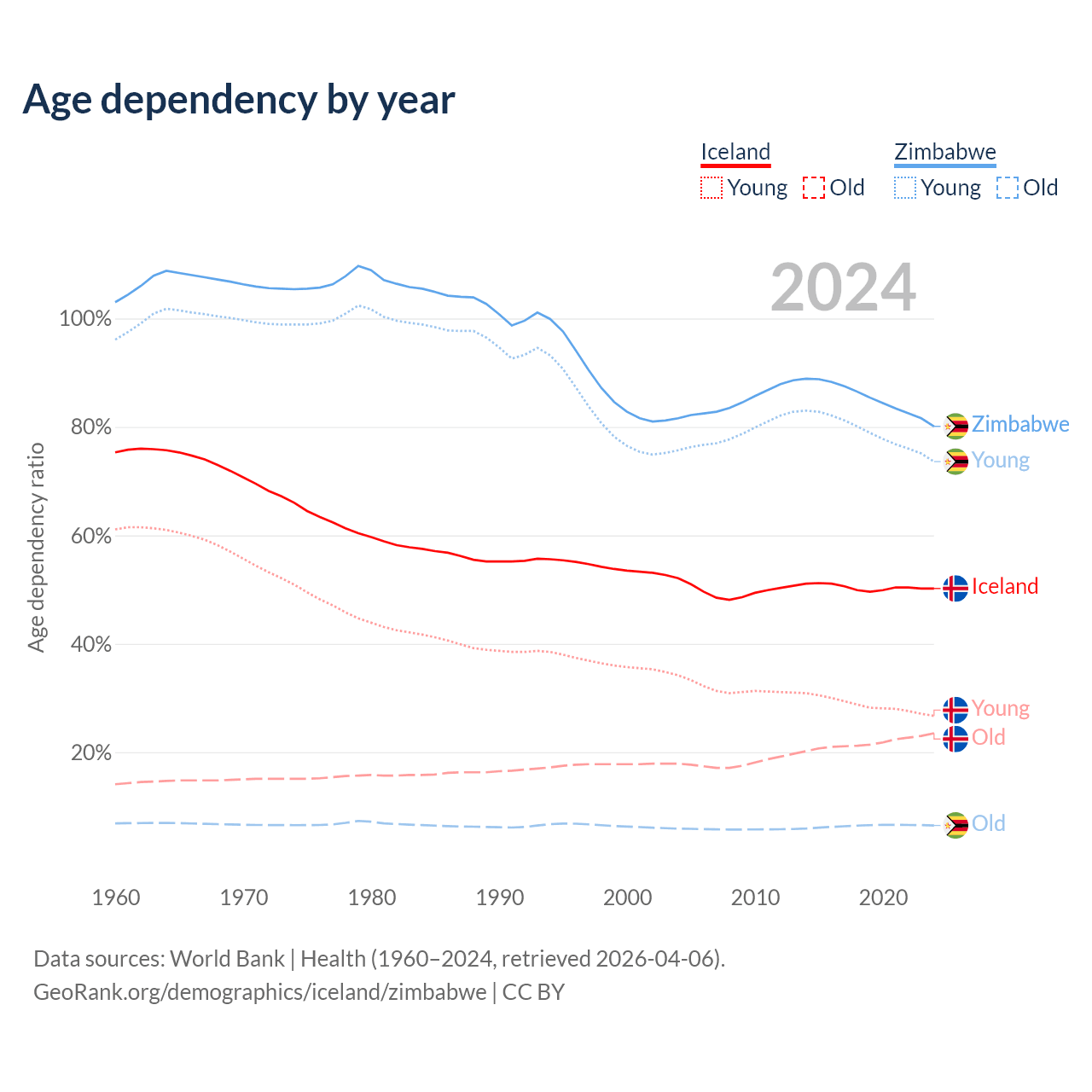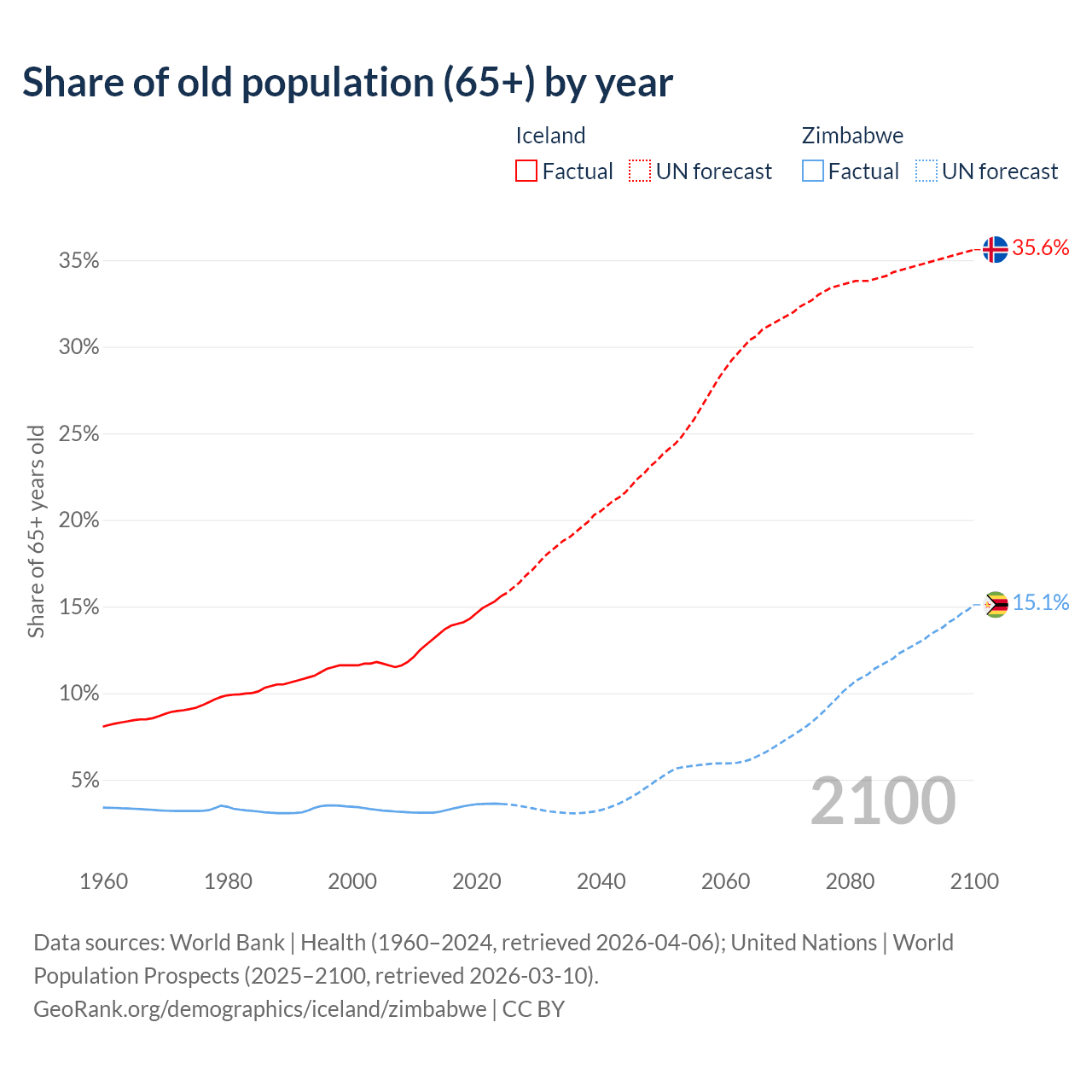 The share of older people aged 65 and over is 15.6% in Iceland and 3.6% in Zimbabwe. Life expectancy in Iceland compared to Zimbabwe .