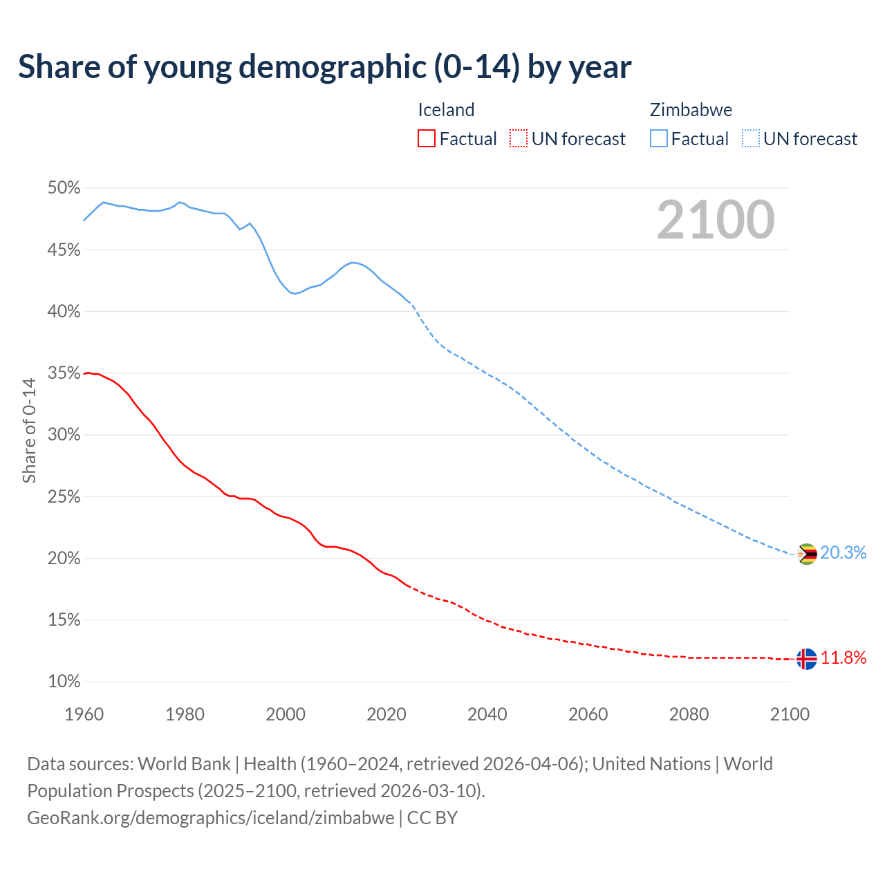 - The share of young demographic (0-15 years old) in Iceland is 17.8% vs 40.9% in Zimbabwe.