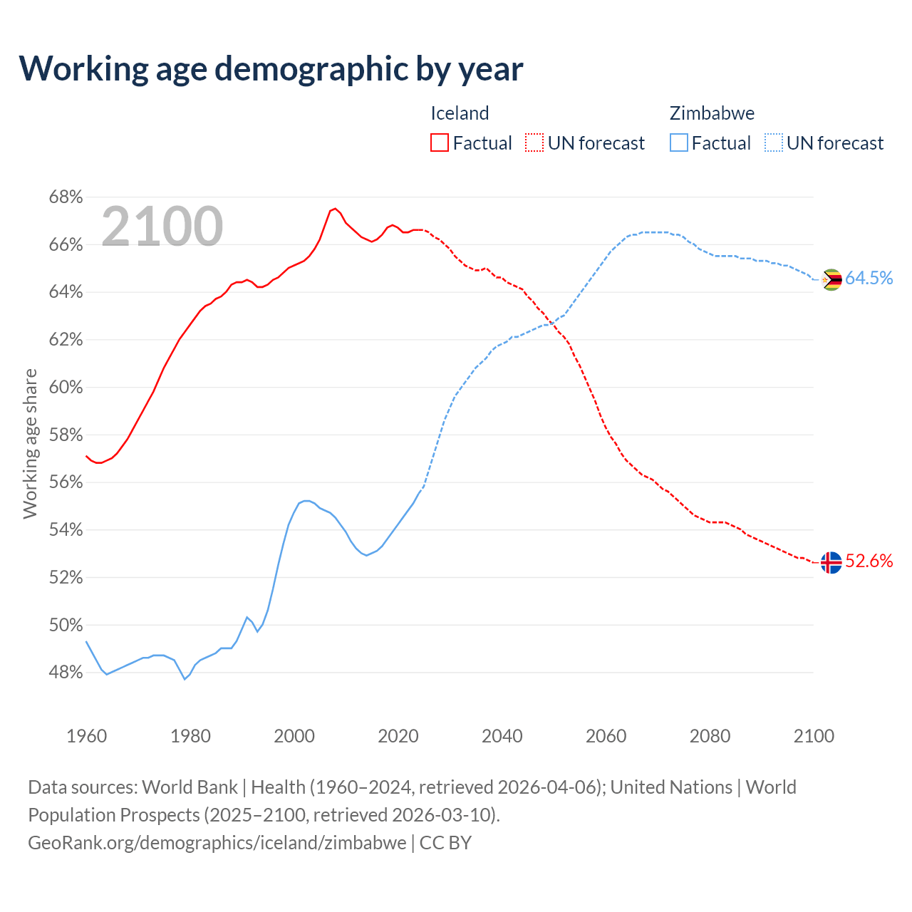 Median age Iceland vs Zimbabwe, 1960-2100