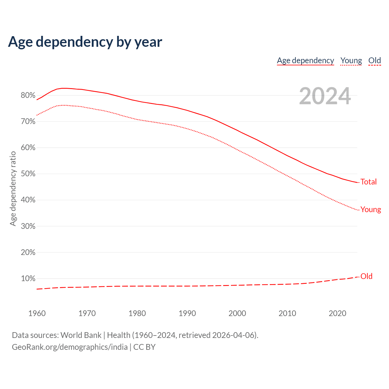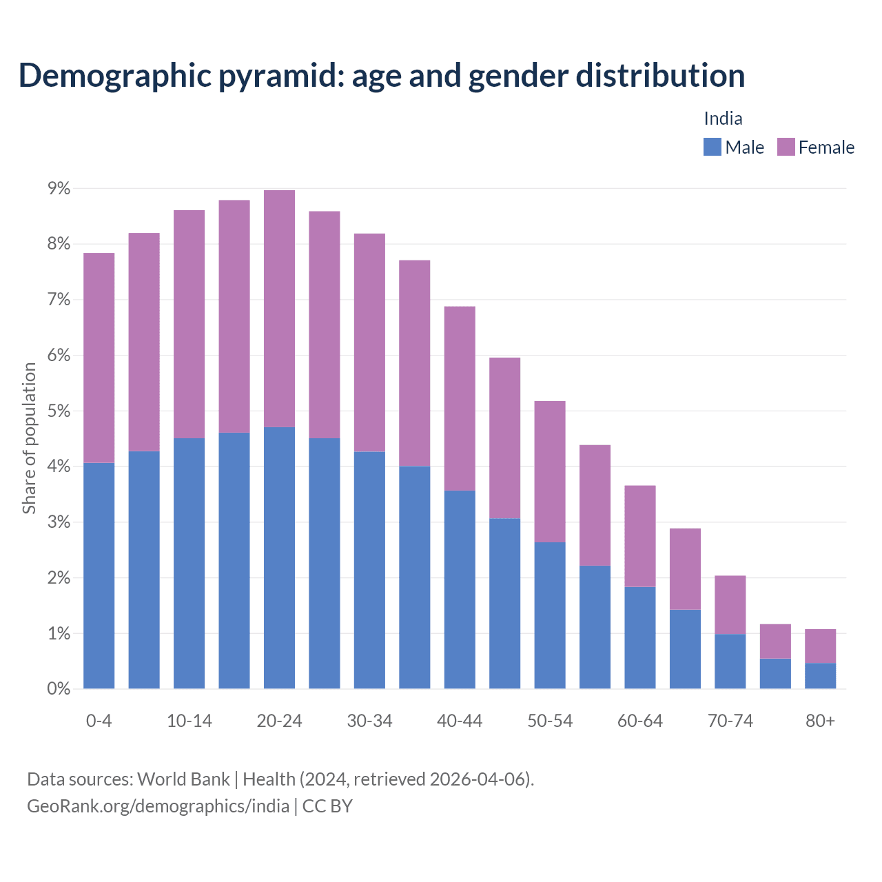 With a population of 1.45B people, India has a median age of 29.5 years which makes it the 108/196 oldest country. 24.6% of the demographic are children 0-14 years old, 68.2% are working-age people aged 15-64, and 7.15% are older population aged 65+ years.