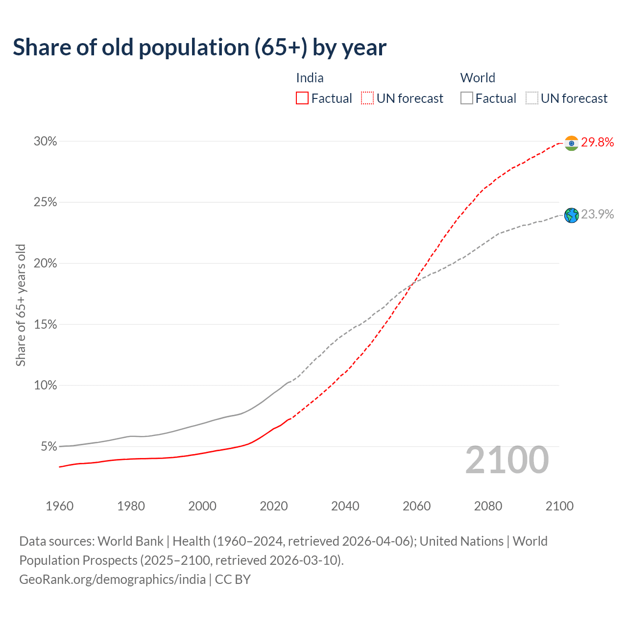The share of older people aged 65 and over in India increased from 4.63% to 7.15% between 2004 and 2024.
