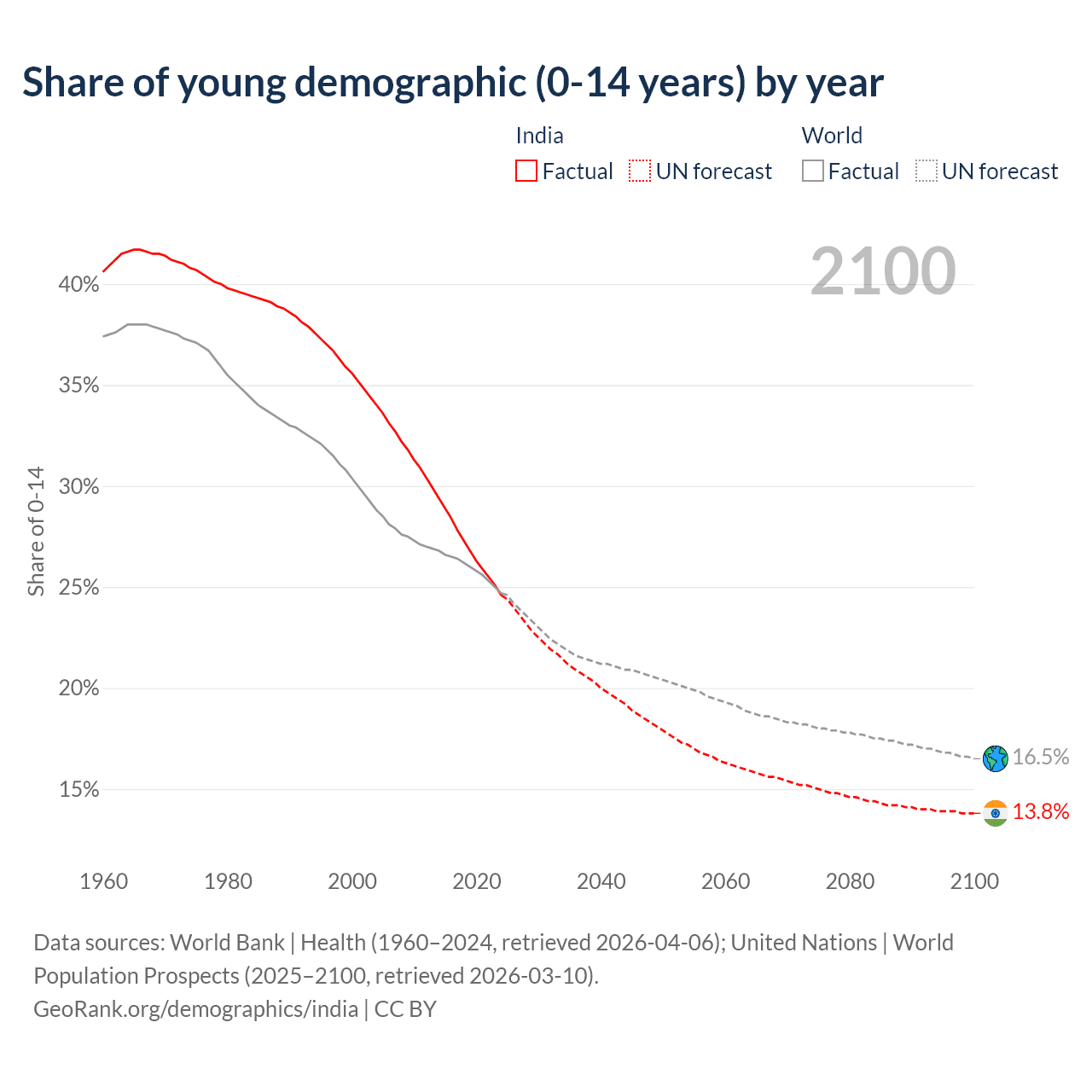 The share of children aged 0-14 in India decreased from 34% to 24.6% between 2004 and 2024 due to changes in birth rates.
