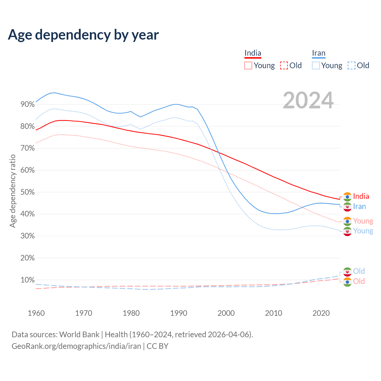- The share of old-age demographic (65+) in India is 7.15% vs 8.24% in Iran.