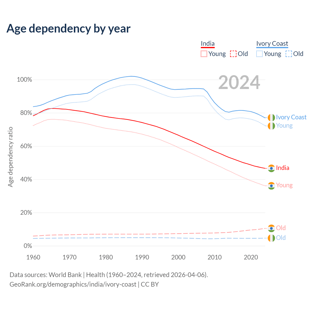 - India is ranked 108/196 by median age (oldest to youngest) vs 175/196 for Ivory Coast.