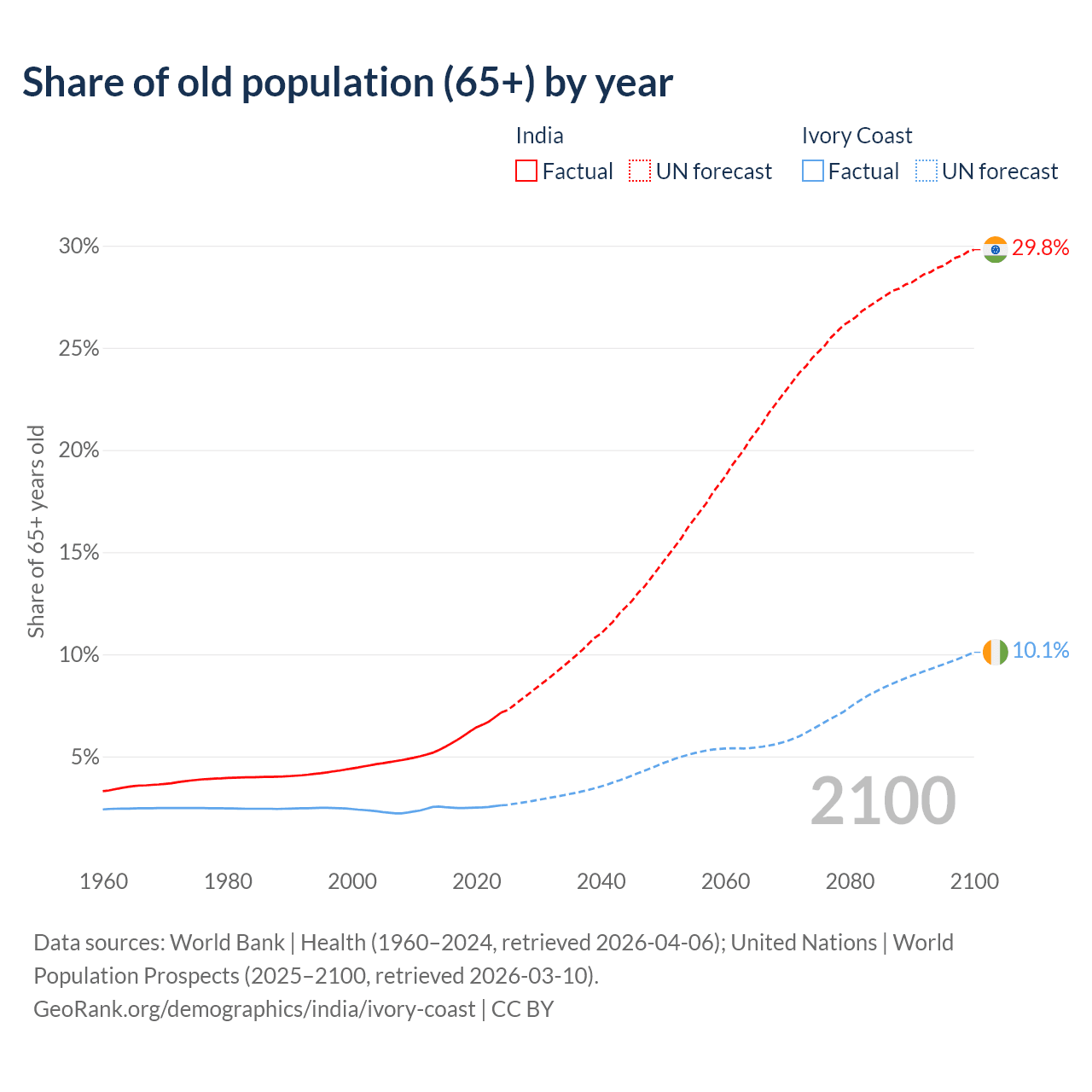 - The share of old-age demographic (65+) in India is 7.15% vs 2.61% in Ivory Coast.