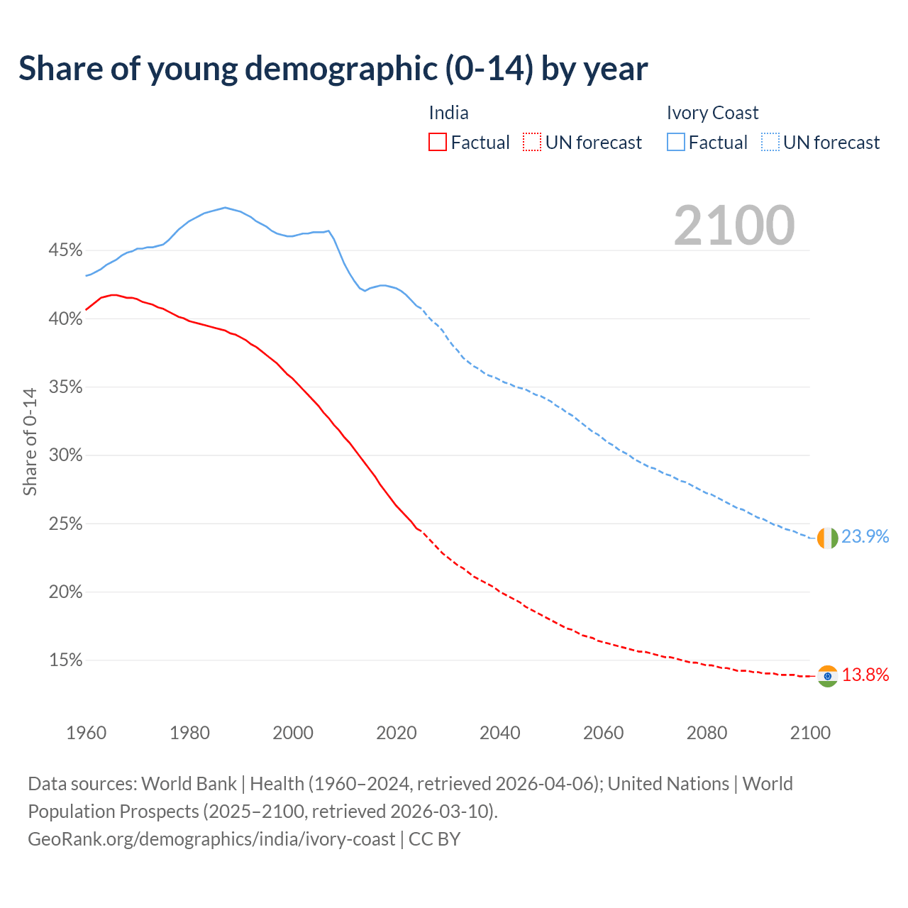 - The share of young demographic (0-15 years old) in India is 24.6% vs 40.9% in Ivory Coast.