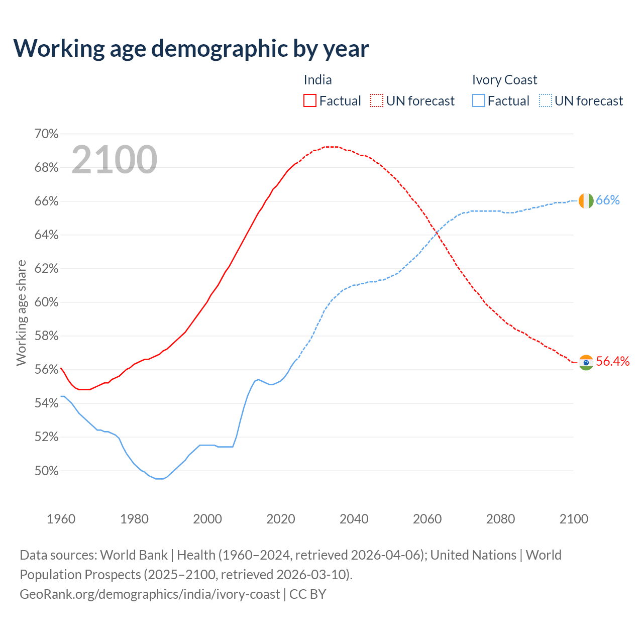 - India has 1.01B working age adults (aged 15-64) vs 19.1M in Ivory Coast.