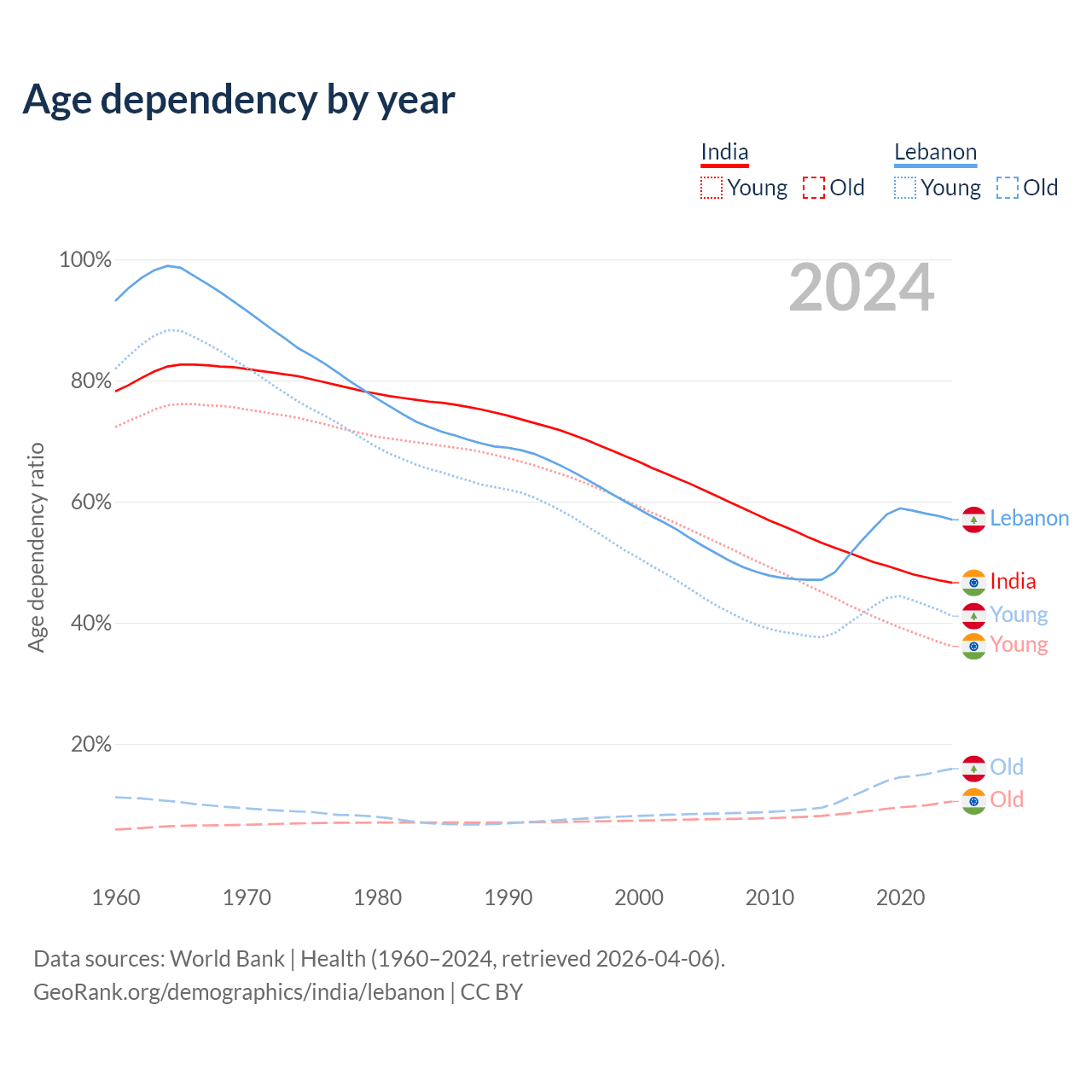 - India is ranked 108/196 by median age (oldest to youngest) vs 106/196 for Lebanon.