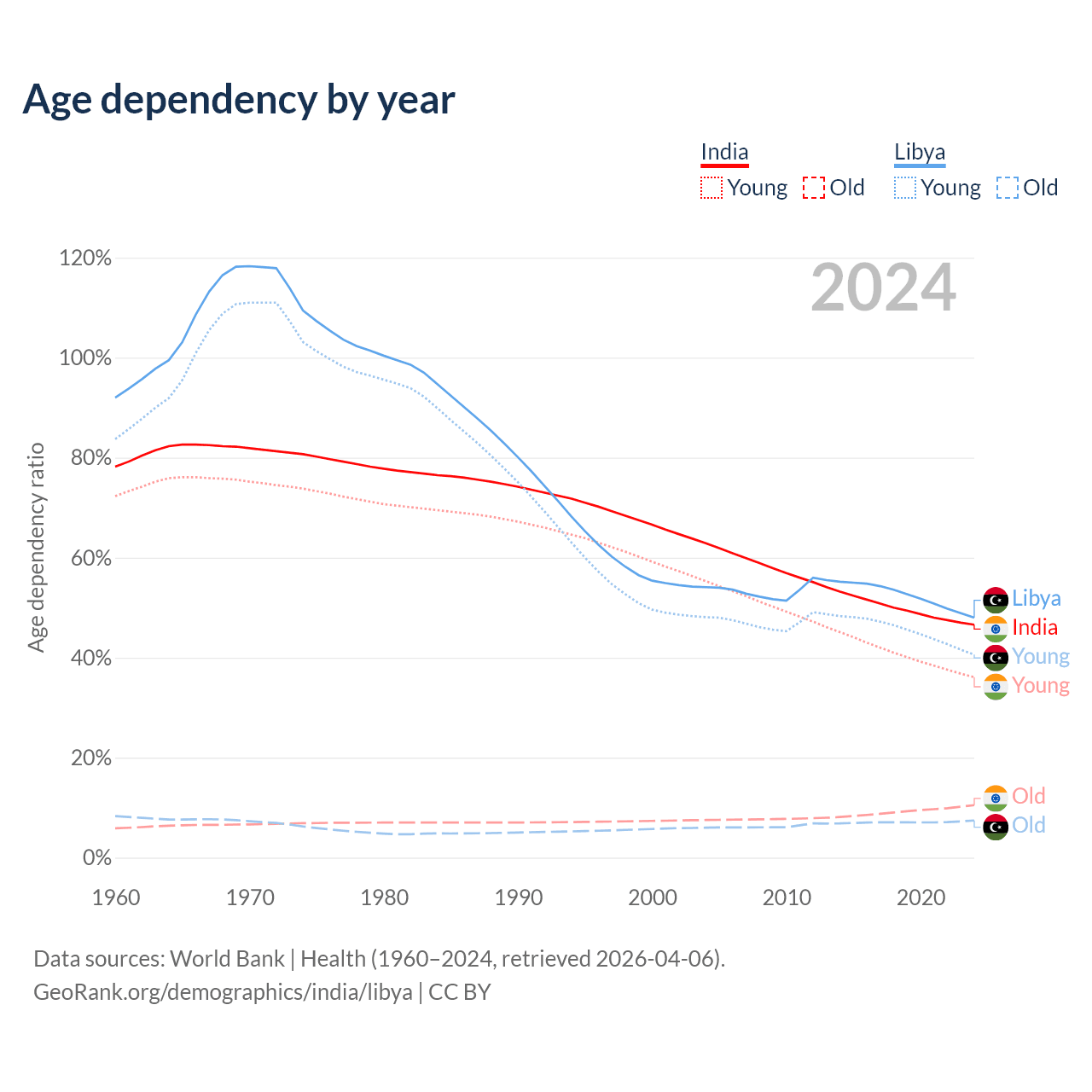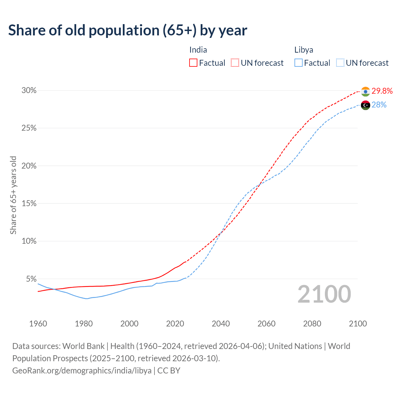 The share of older people aged 65 and over is 7.15% in India and 5.02% in Libya. Life expectancy in India compared to Libya .