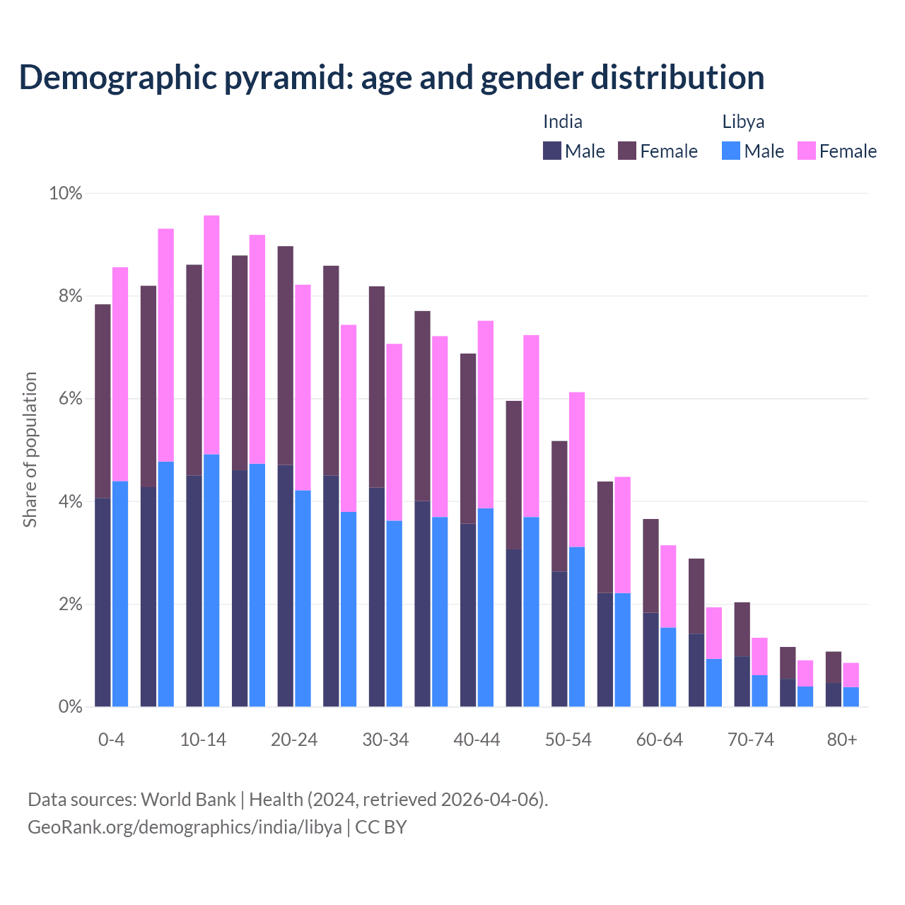 - The share of old-age demographic (65+) in India is 7.15% vs 5.02% in Libya.