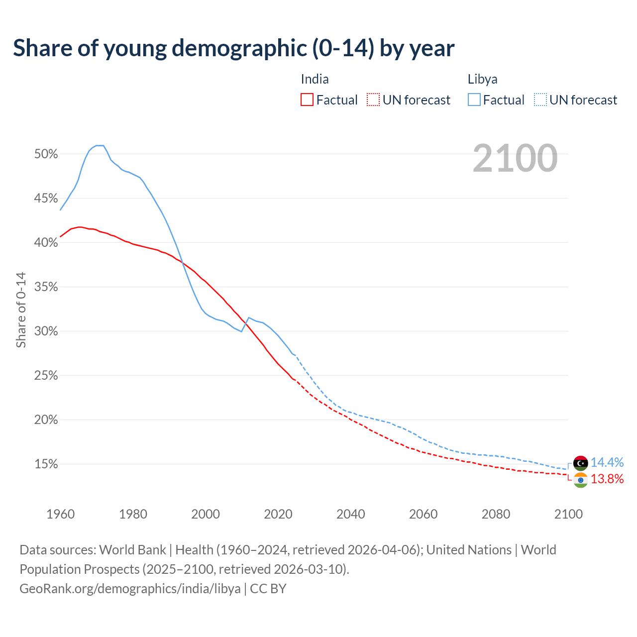 - The share of young demographic (0-15 years old) in India is 24.6% vs 27.4% in Libya.