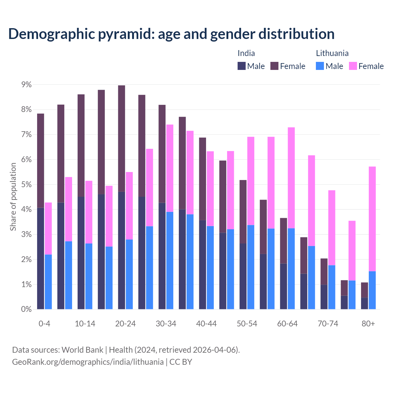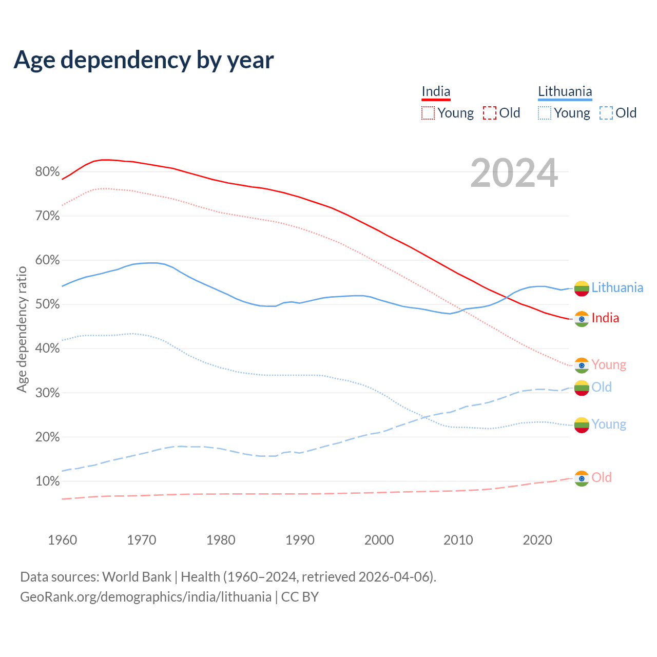 - India is ranked 108/196 by median age (oldest to youngest) vs 28/196 for Lithuania.