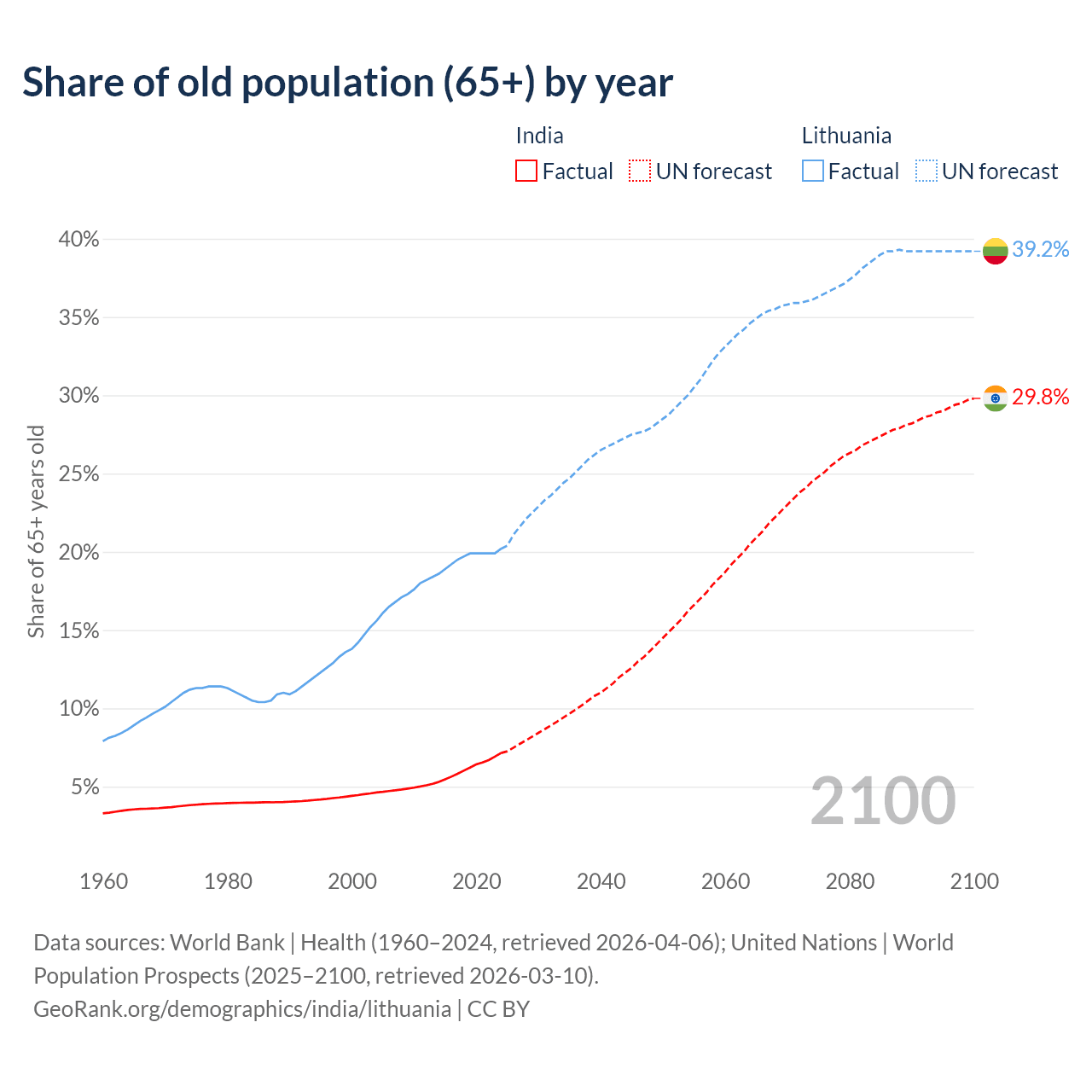 The share of older people aged 65 and over is 7.15% in India and 20.2% in Lithuania. Life expectancy in India compared to Lithuania .