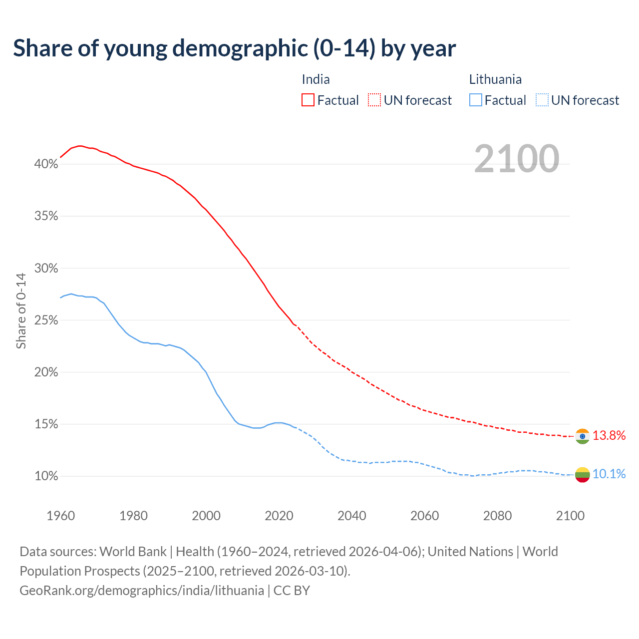 - The share of young demographic (0-15 years old) in India is 24.6% vs 14.7% in Lithuania.