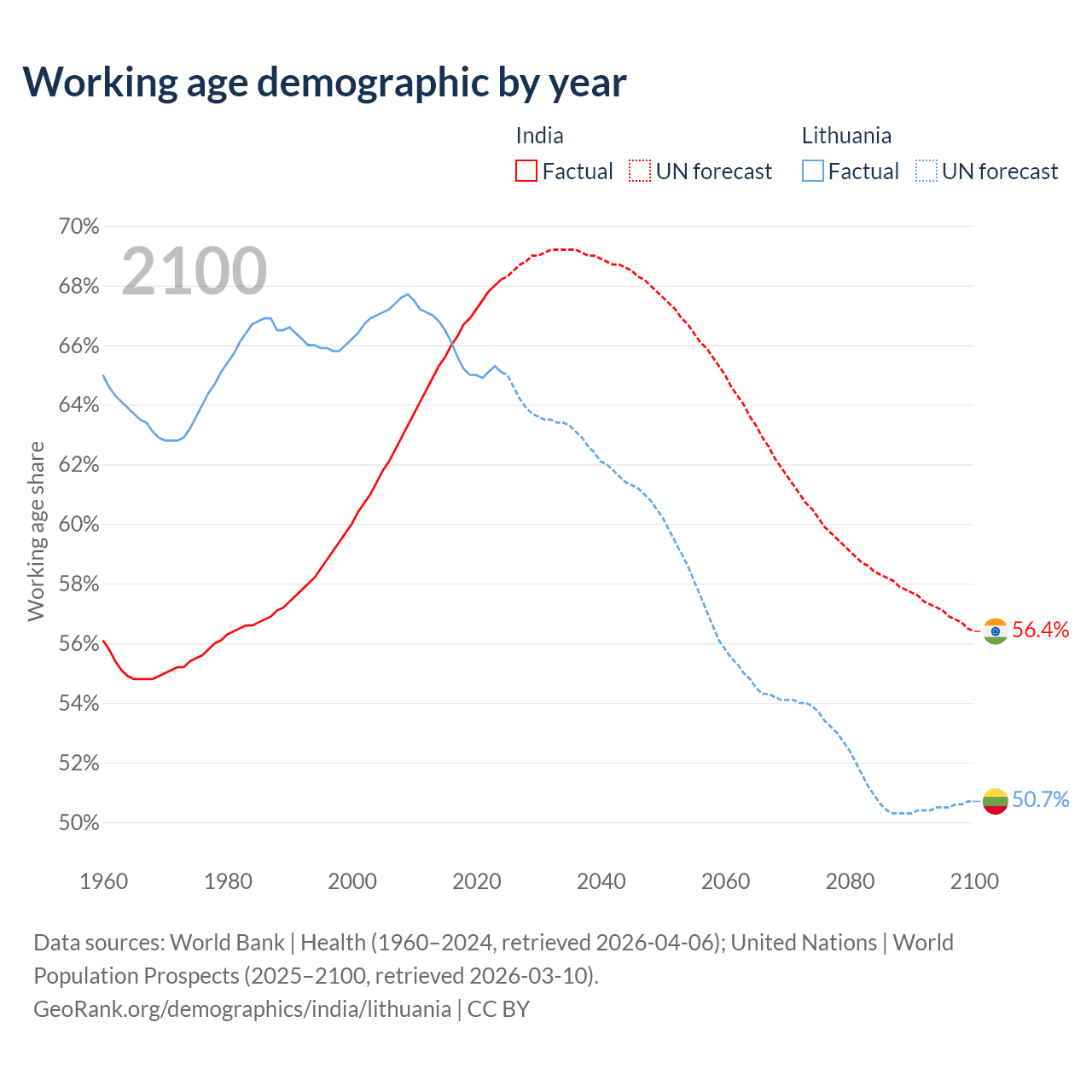 - India has 1.01B working age adults (aged 15-64) vs 1.84M in Lithuania.