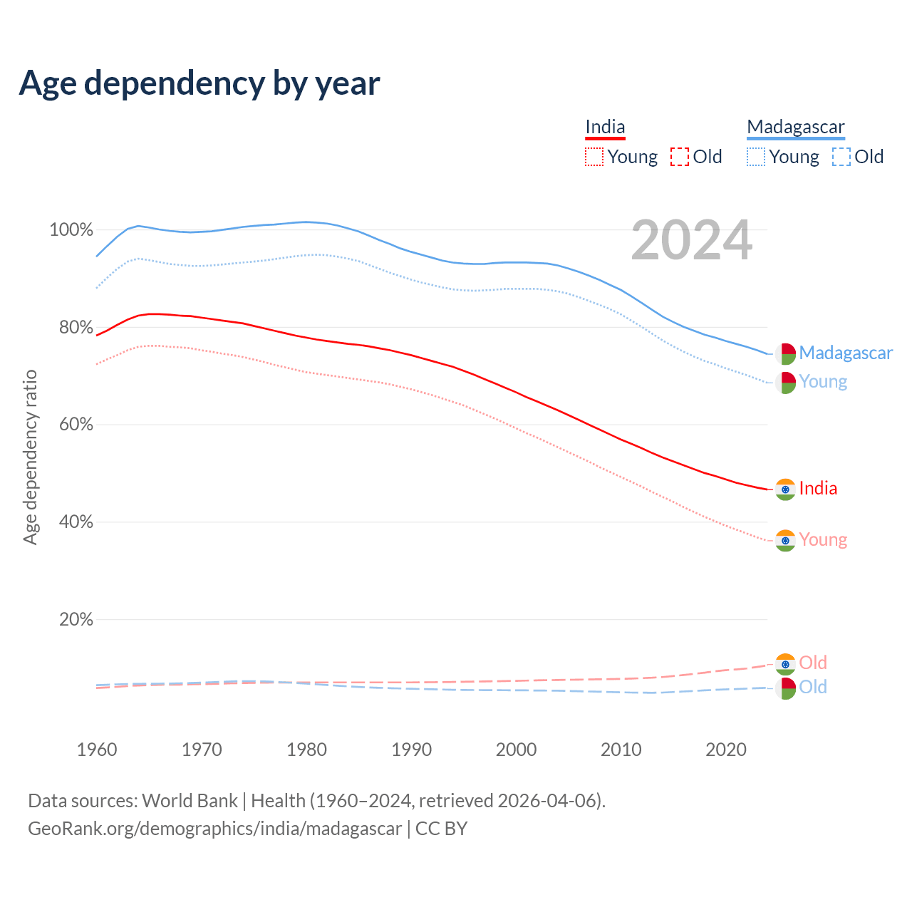 - India is ranked 108/196 by median age (oldest to youngest) vs 165/196 for Madagascar.