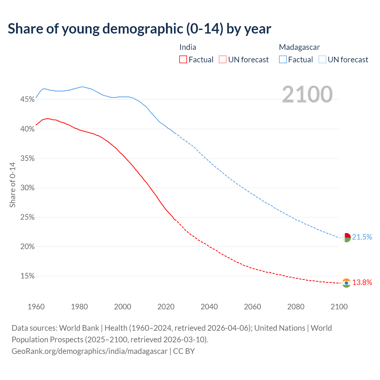 - The share of young demographic (0-15 years old) in India is 24.6% vs 39.3% in Madagascar.
