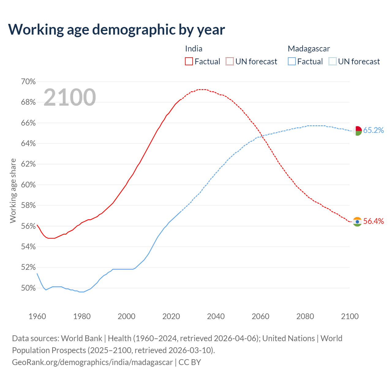 - India has 1.01B working age adults (aged 15-64) vs 19.4M in Madagascar.
