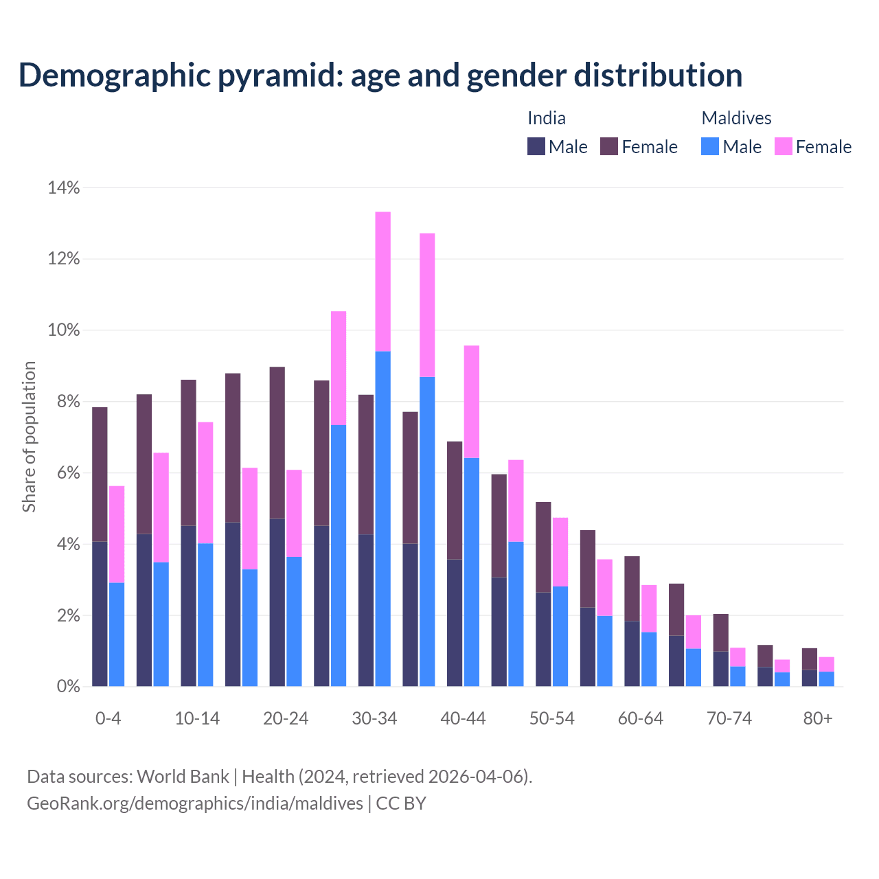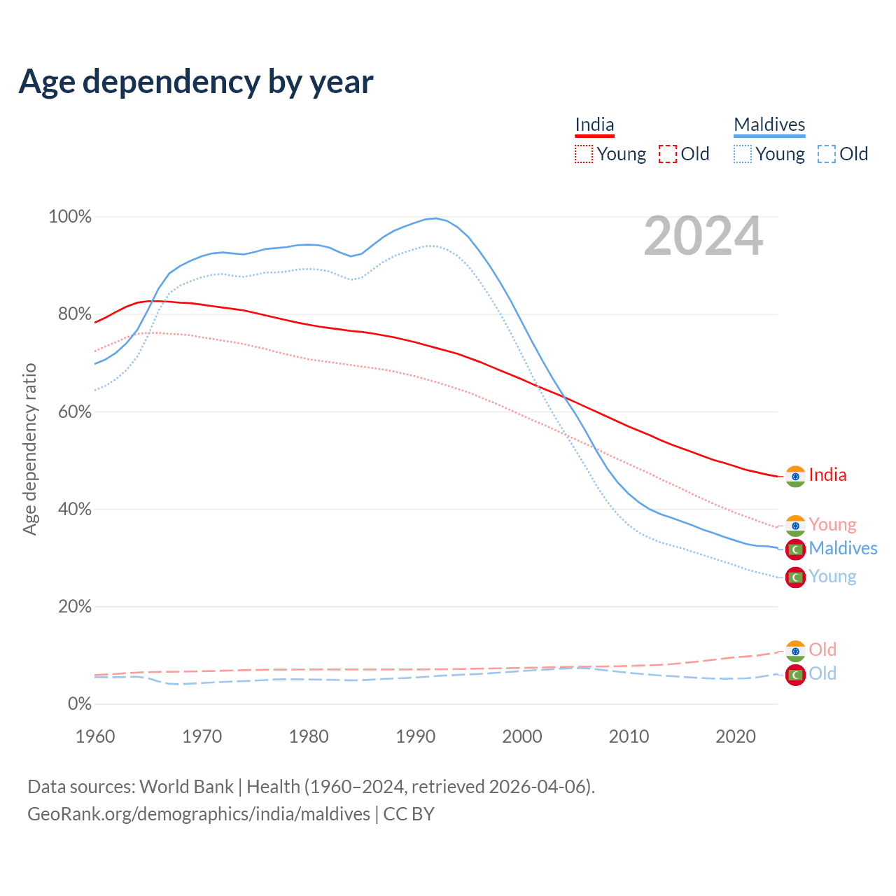 - India is ranked 108/196 by median age (oldest to youngest) vs 90/196 for Maldives.
