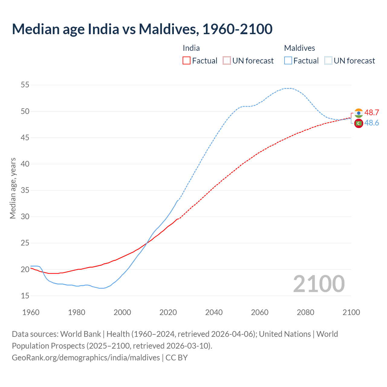 Median age India vs Maldives, 1960-2100